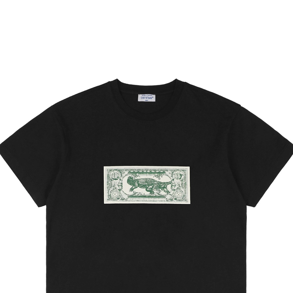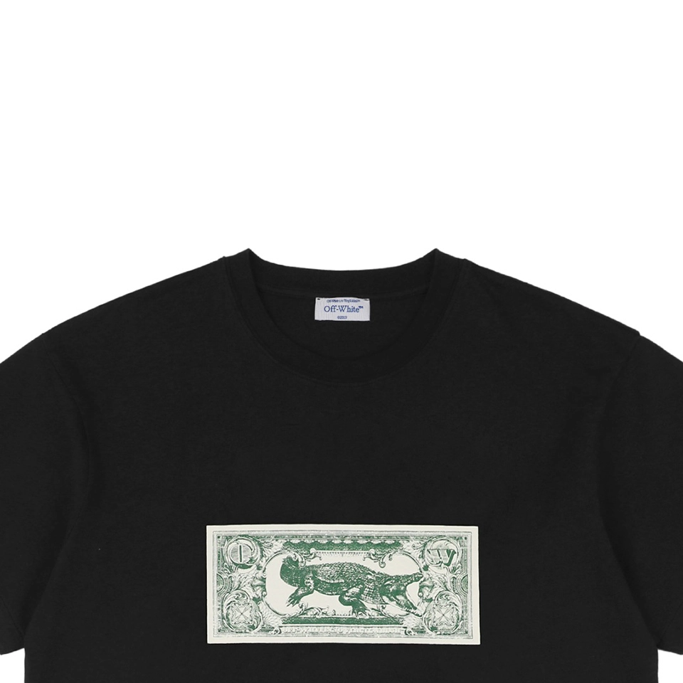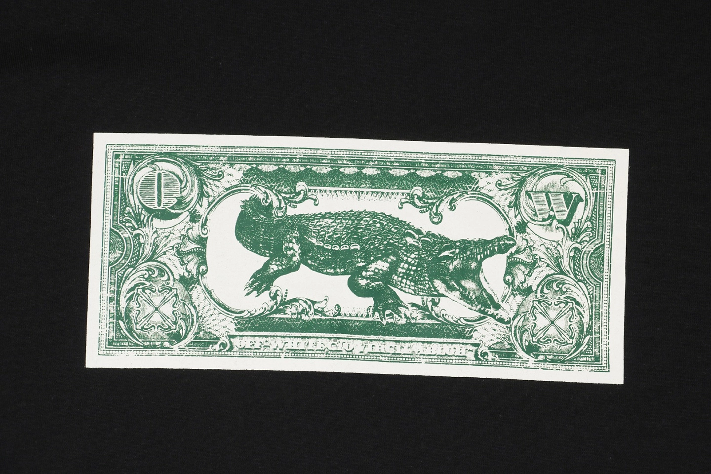 The OFF-WHITE Crocodile Dollar Print T-shirt blends bold street style with playful luxury symbolism. Featuring a striking crocodile dollar graphic at the chest, this black tee channels Off-White’s signature ironic aesthetic. The back is detailed with the brand’s iconic arrow motif in subtle green linework, creating a statement piece that’s both eye-catching and sophisticated. Crafted from soft, breathable cotton, this t-shirt ensures everyday comfort with a modern streetwear edge.