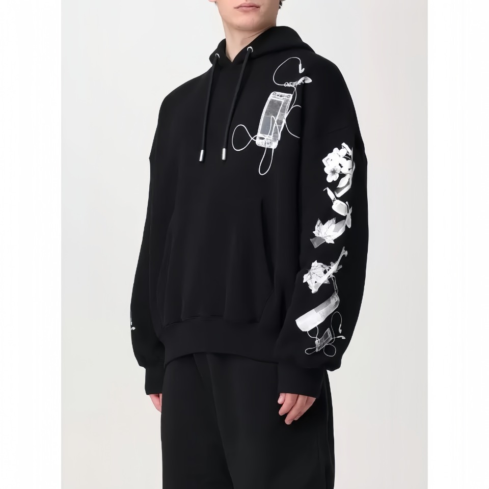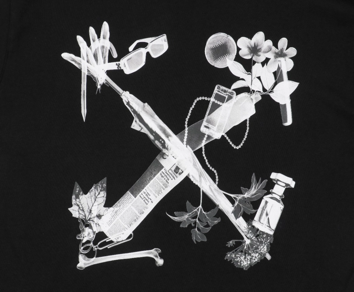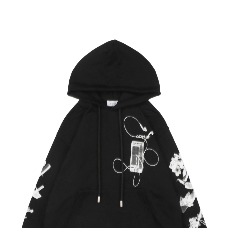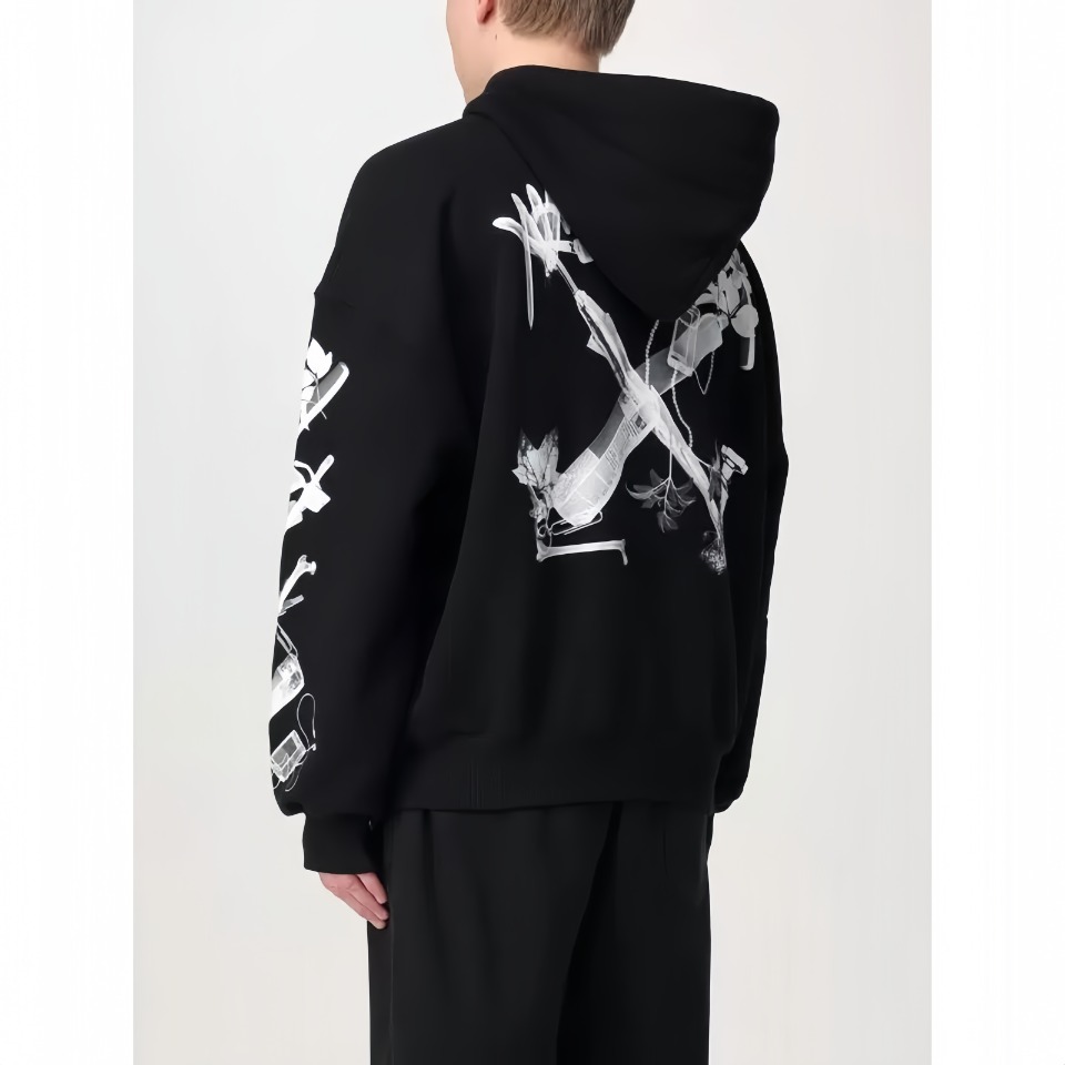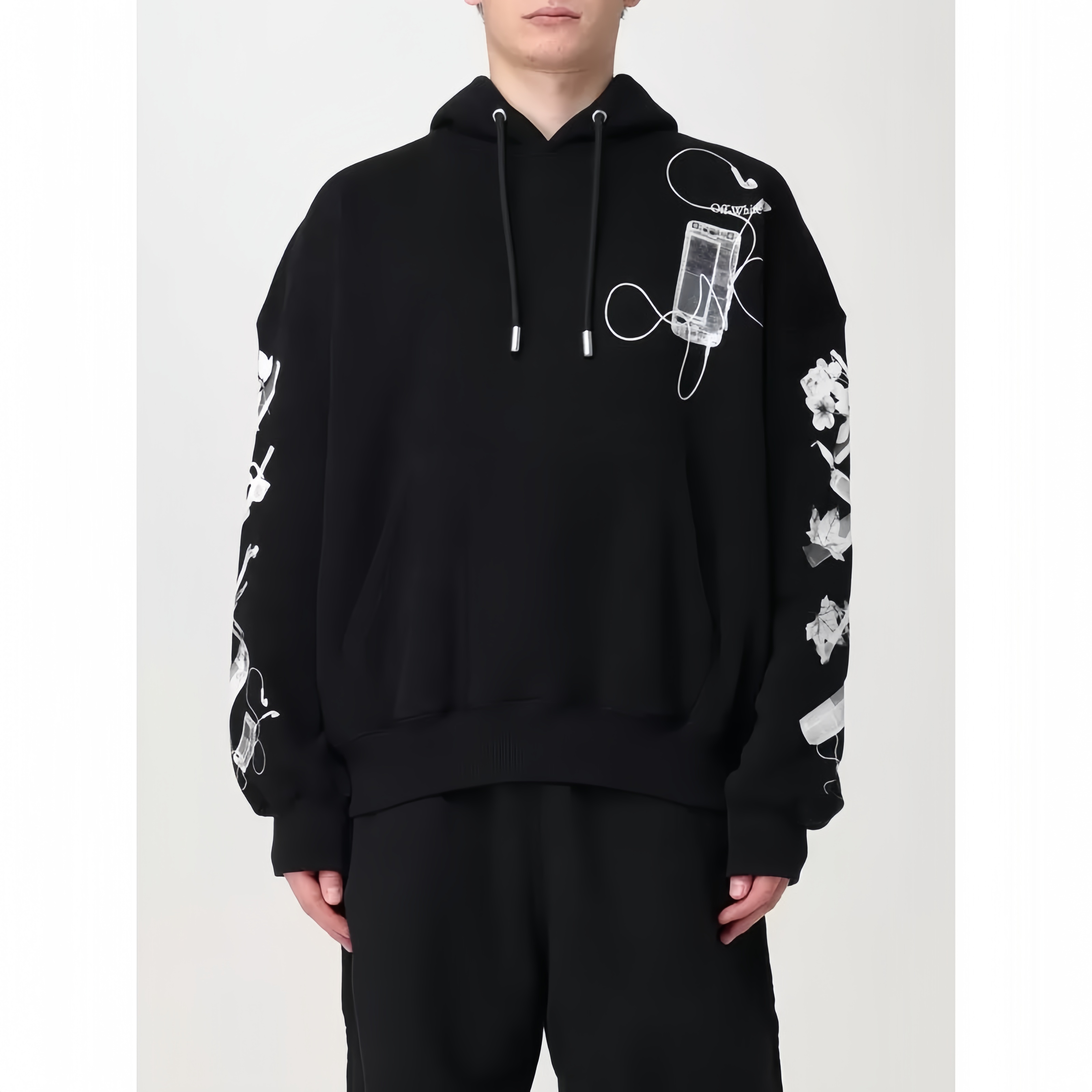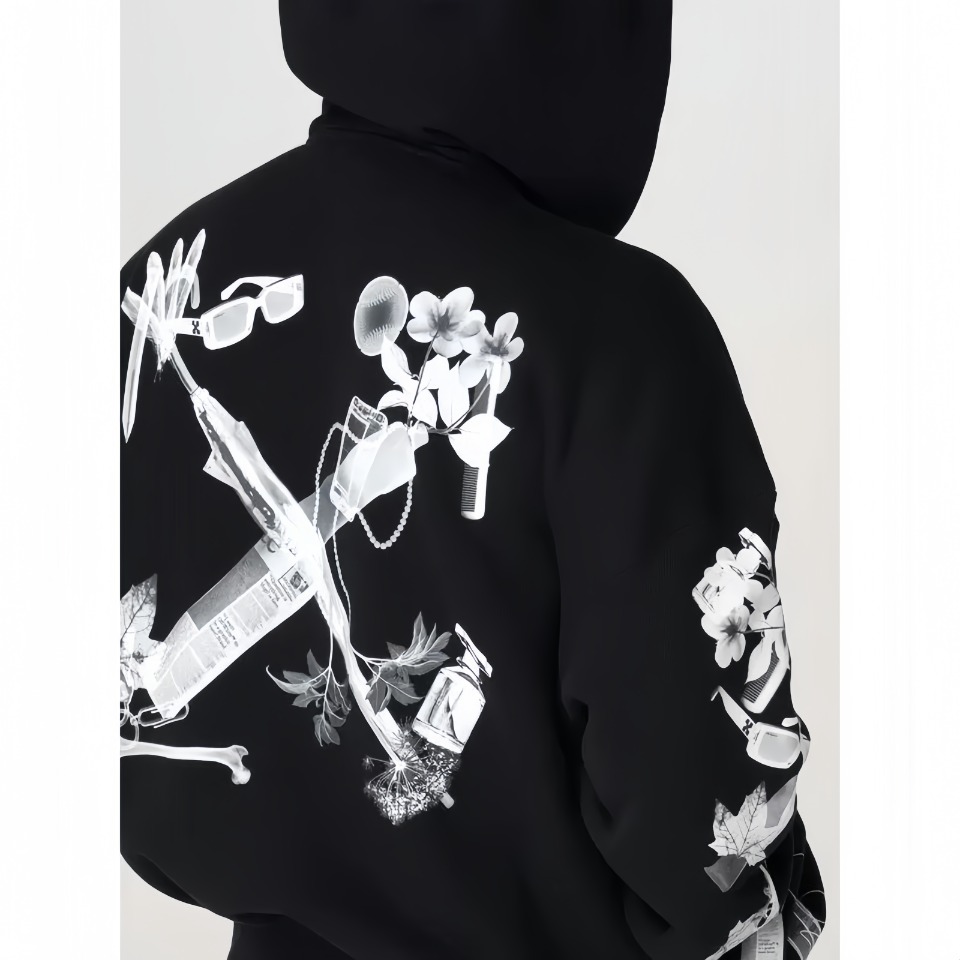 The Off-White Digital Earphone Arrow Print Hoodie showcases a futuristic reinterpretation of the brand’s signature Arrow motif. Crafted in soft black cotton, it features intricate X-ray-inspired prints of digital earphones, flowers, and everyday objects. These striking visuals wrap around the chest, sleeves, and back, creating a layered, tech-infused aesthetic. With a relaxed fit and street-ready appeal, this hoodie seamlessly blends comfort with avant-garde style.
