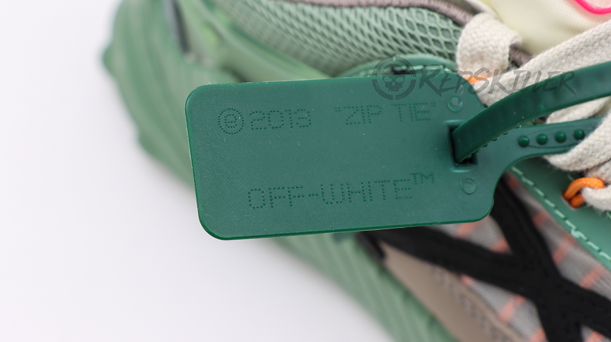 This particular “Mint” version features a refreshing mint green colorway, accented with contrasting panels of black, grey, and pink. The upper is a mix of mesh and suede, providing texture and depth while ensuring durability and breathability. Signature details such as the iconic zip tie and the bold “OFF-WHITE” branding on the lateral side are present, reinforcing the shoe’s streetwear credentials.
