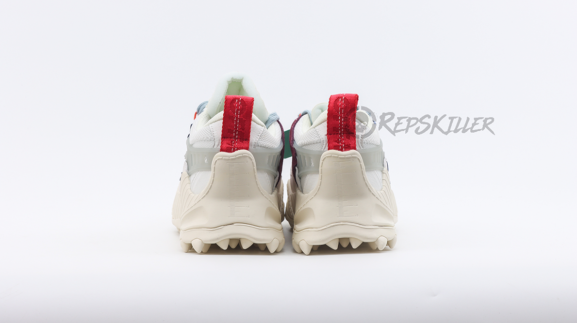 This model features a striking “White Multi” colorway, distinguished by its eclectic mix of colors and textures across various panels. The upper is crafted from a combination of high-quality materials, including lightweight mesh and durable leather, all sitting atop a chunky, sculpted sole that adds both height and a futuristic edge to the silhouette. The shoe’s overall aesthetic is punctuated with vibrant splashes of color and the signature Off-White industrial tag, adding a touch of Abloh’s renowned design language.