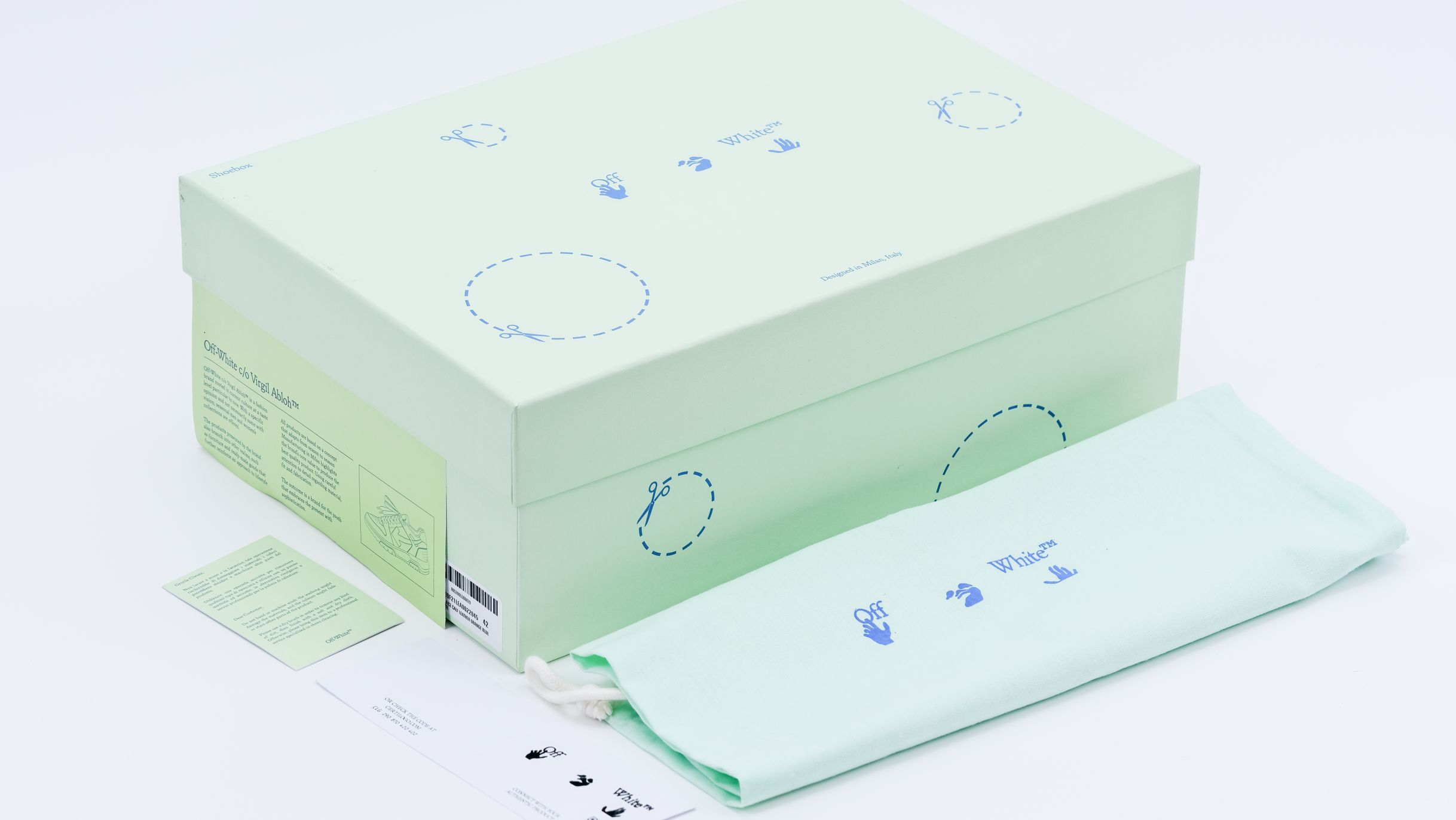Key Off-White signatures, such as the red zip-tie and the quotation marks around “OFF” on the laces, add distinctive branding elements that are instantly recognizable. The side of the sneaker is adorned with the iconic arrows logo, further asserting its designer credentials. The “FOR WALKING” text, another hallmark of Off-White’s playful approach to fashion, is prominently displayed, blending irony with luxury.