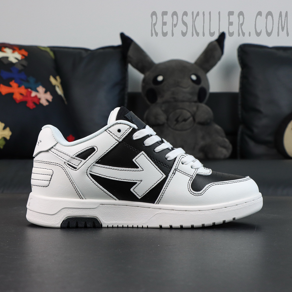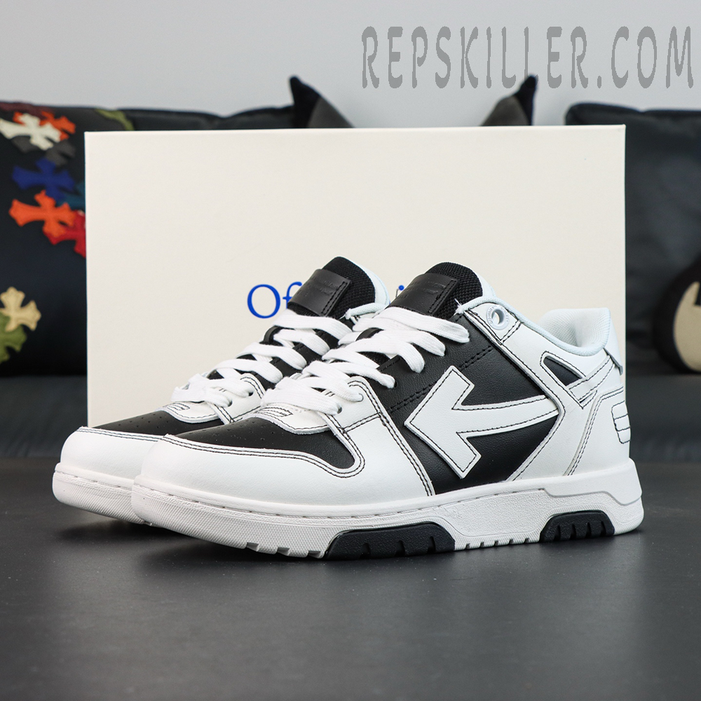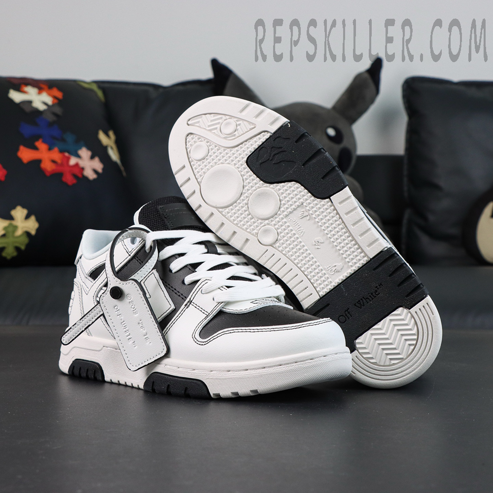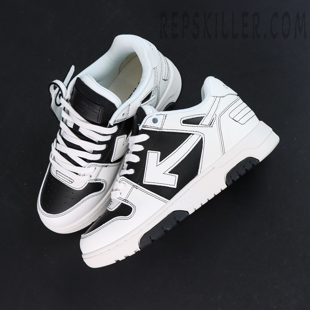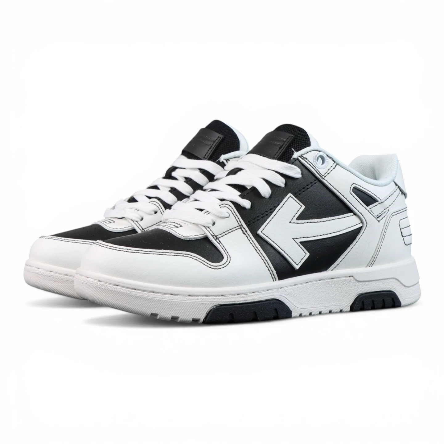 Constructed from premium leather, the upper features a high-contrast black and white color blocking, creating a strong visual identity inspired by classic sci-fi tones. The signature Off-White Arrow logo stands out in white against the black quarter panel, enhancing brand recognition while keeping the design sleek and minimal.