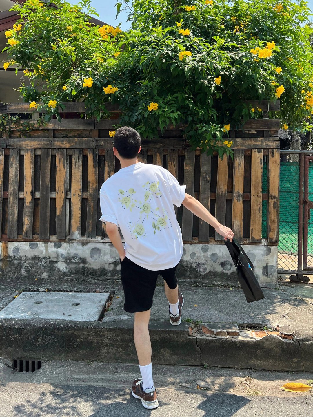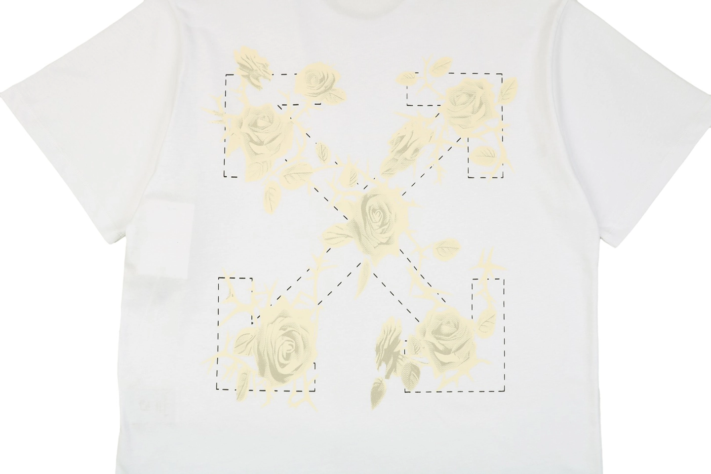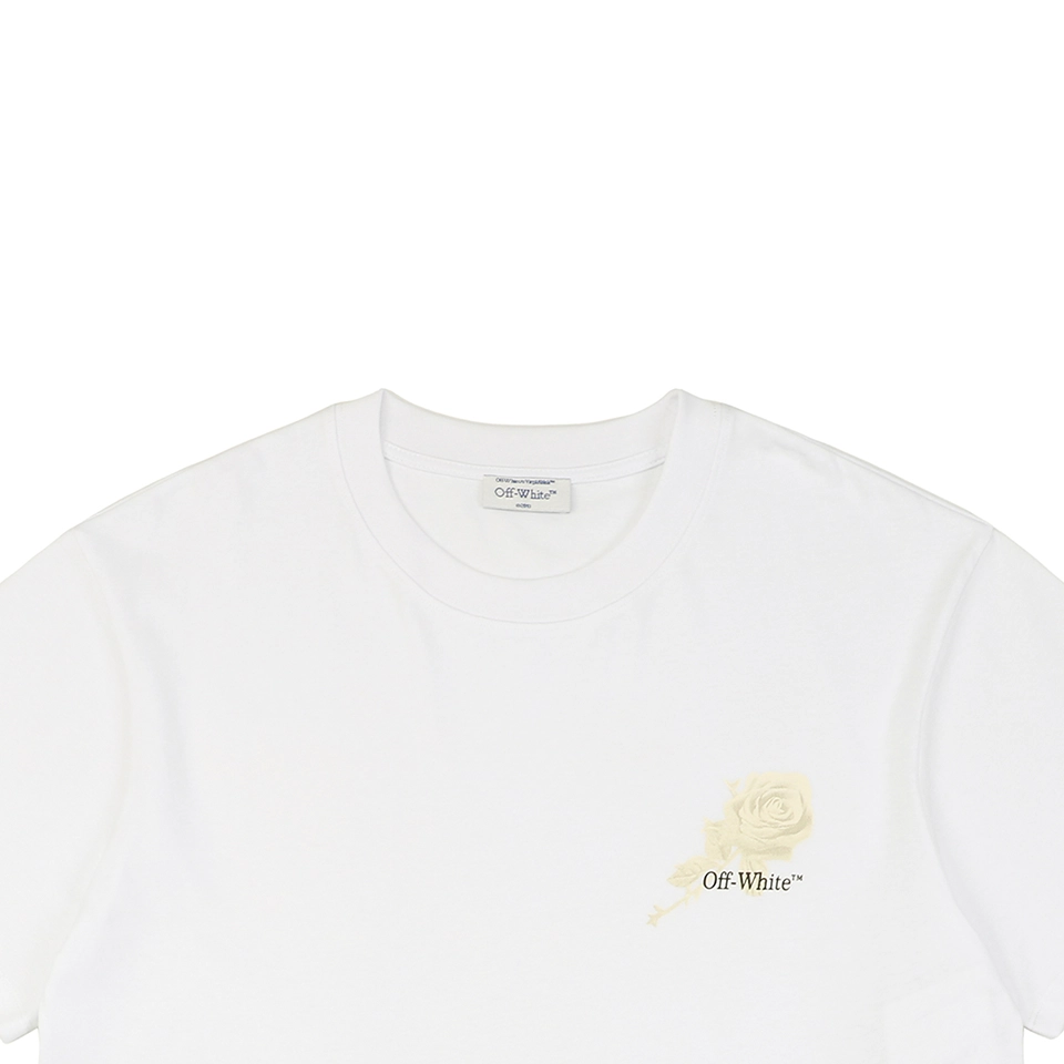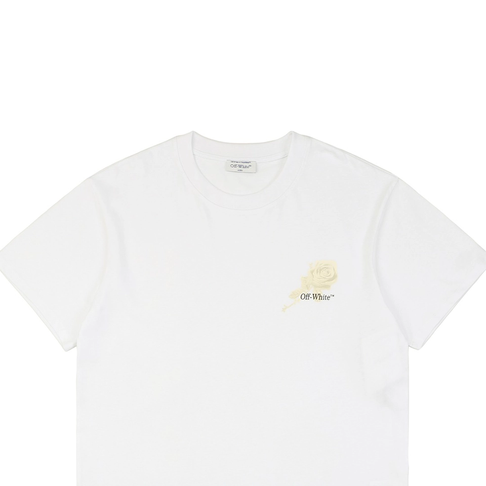 The OFF WHITE Rose Floral Arrow Graphic T-Shirt juxtaposes the label’s iconic Arrow emblem with romantic blooming roses, blending toughness and delicacy in one design. The large back print draws the eye with intricate floral detailing laid over a minimal base. Cut in a loose drop-shoulder silhouette and crafted from heavyweight cotton, this tee delivers a powerful visual statement while offering all-day comfort and durability.