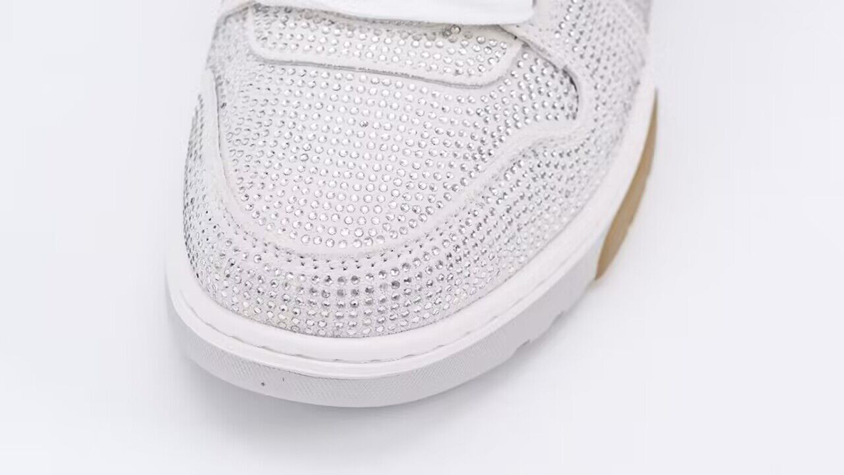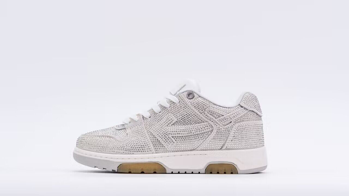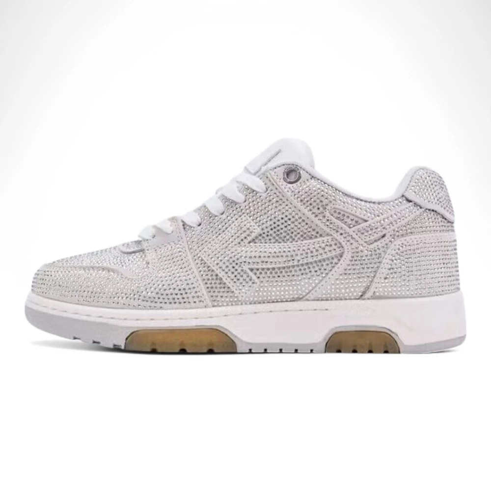 The Off-White Wmns Out Of Office ‘White Strass’ sneaker is a luxurious and eye-catching version of Off-White’s popular lifestyle sneaker line. This model, designed for women, combines high-fashion aesthetics with the functionality of a sports sneaker, adorned with unique embellishments that highlight Virgil Abloh’s signature approach to design.