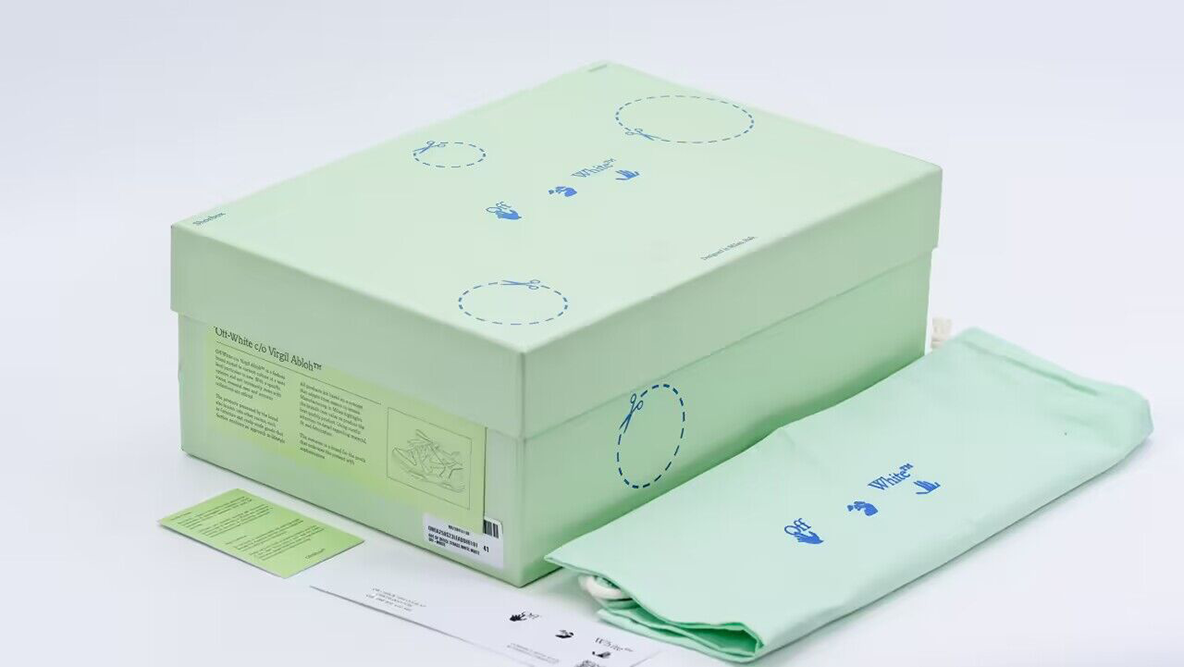 The design retains classic Off-White elements such as the tag and the quoted text on the laces, ensuring that the brand’s iconic motifs are recognizable. The sneaker also features a perforated toe box for breathability, and a diagonal stripe pattern on the midsole, which adds an element of visual interest and ties back to Off-White’s graphic identity.