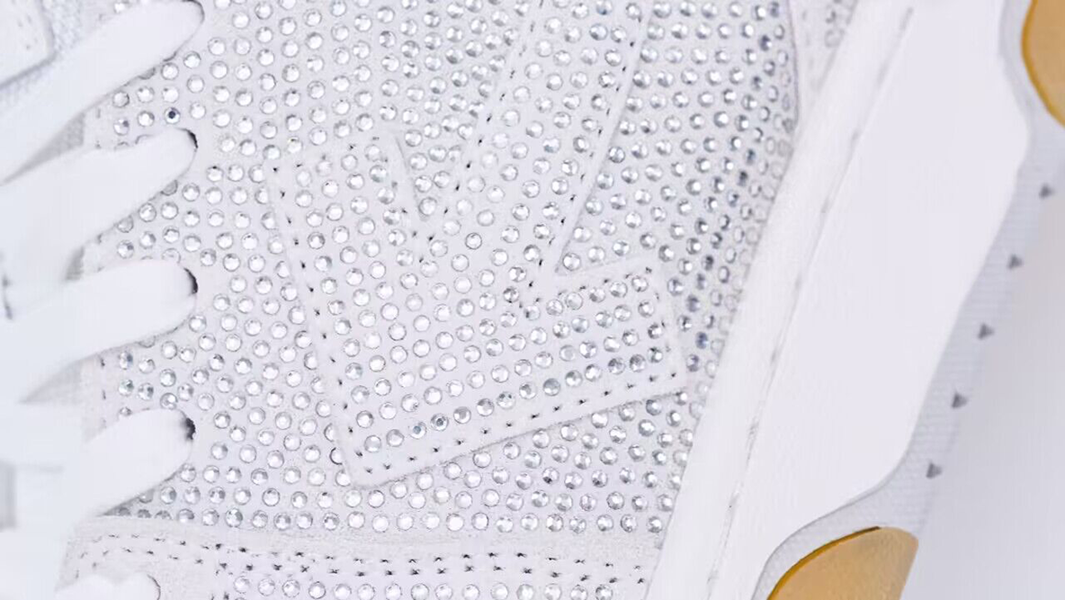 The ‘White Strass’ version features a predominantly white leather upper that serves as a clean canvas for the elaborate details. What sets this particular model apart are the Strass crystals embedded along the sides, adding a glamorous and striking visual element. These crystals catch the light with every step, making the sneakers not just a pair of shoes but a statement piece.
