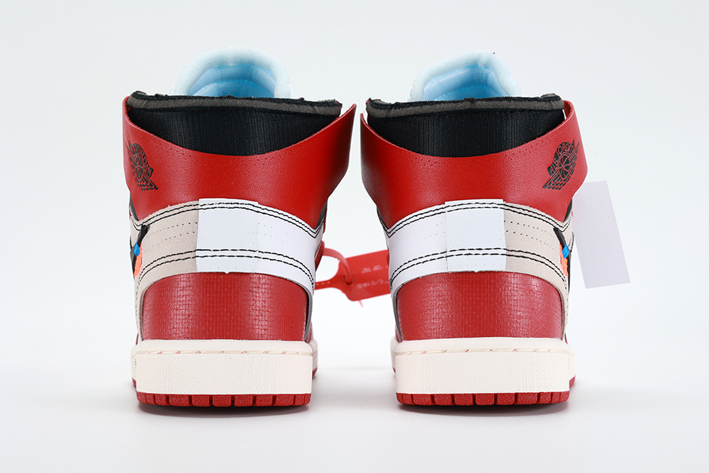 The ‘Chicago’ colorway maintains the legendary red, black, and white scheme associated with Michael Jordan’s early playing days but introduces a host of distinctive design elements that reflect Abloh’s signature aesthetic. The upper features a mix of leather and mesh with exposed foam and stitching that gives the sneaker a raw, industrial look.