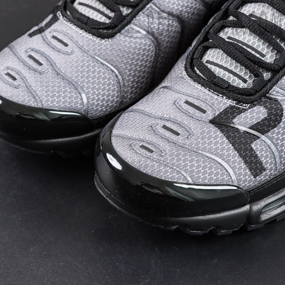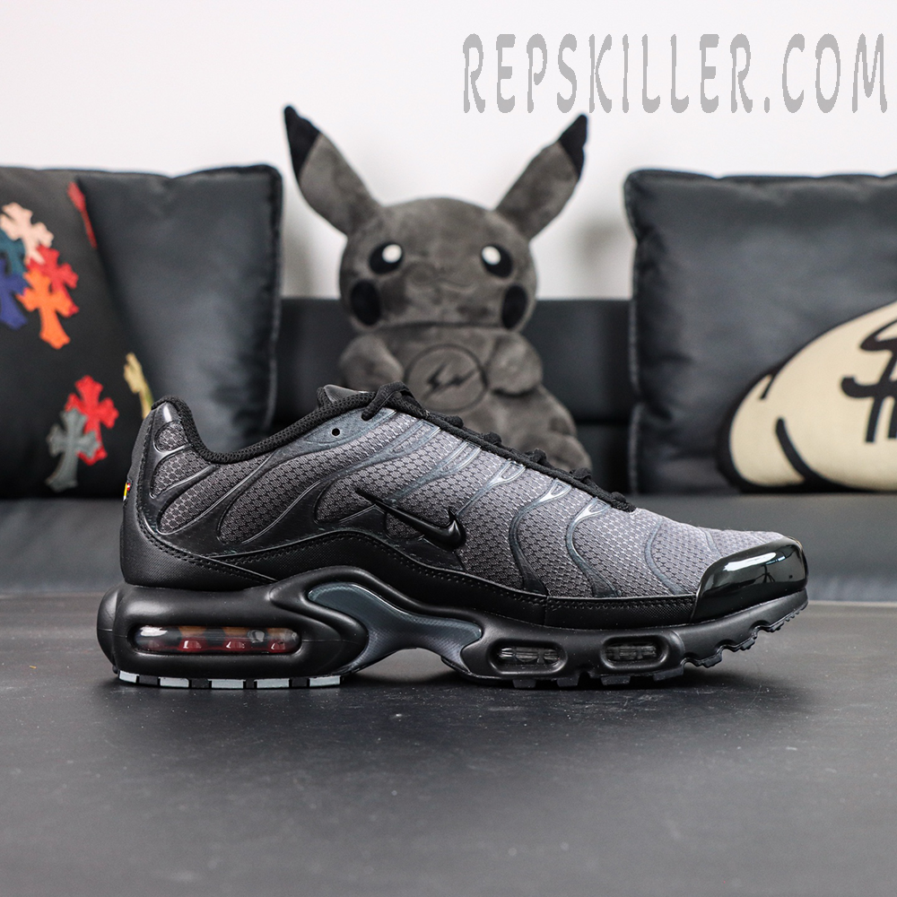The upper features a breathable mesh base dressed in Black and Particle Grey, enhanced by the signature wavy TPU overlays that define the Air Max Plus silhouette. Subtle PSG branding integrates seamlessly into the design, giving the sneaker a refined yet powerful presence. The tonal color scheme ensures versatility, making these best replica sneakers easy to style with both streetwear and techwear fits.