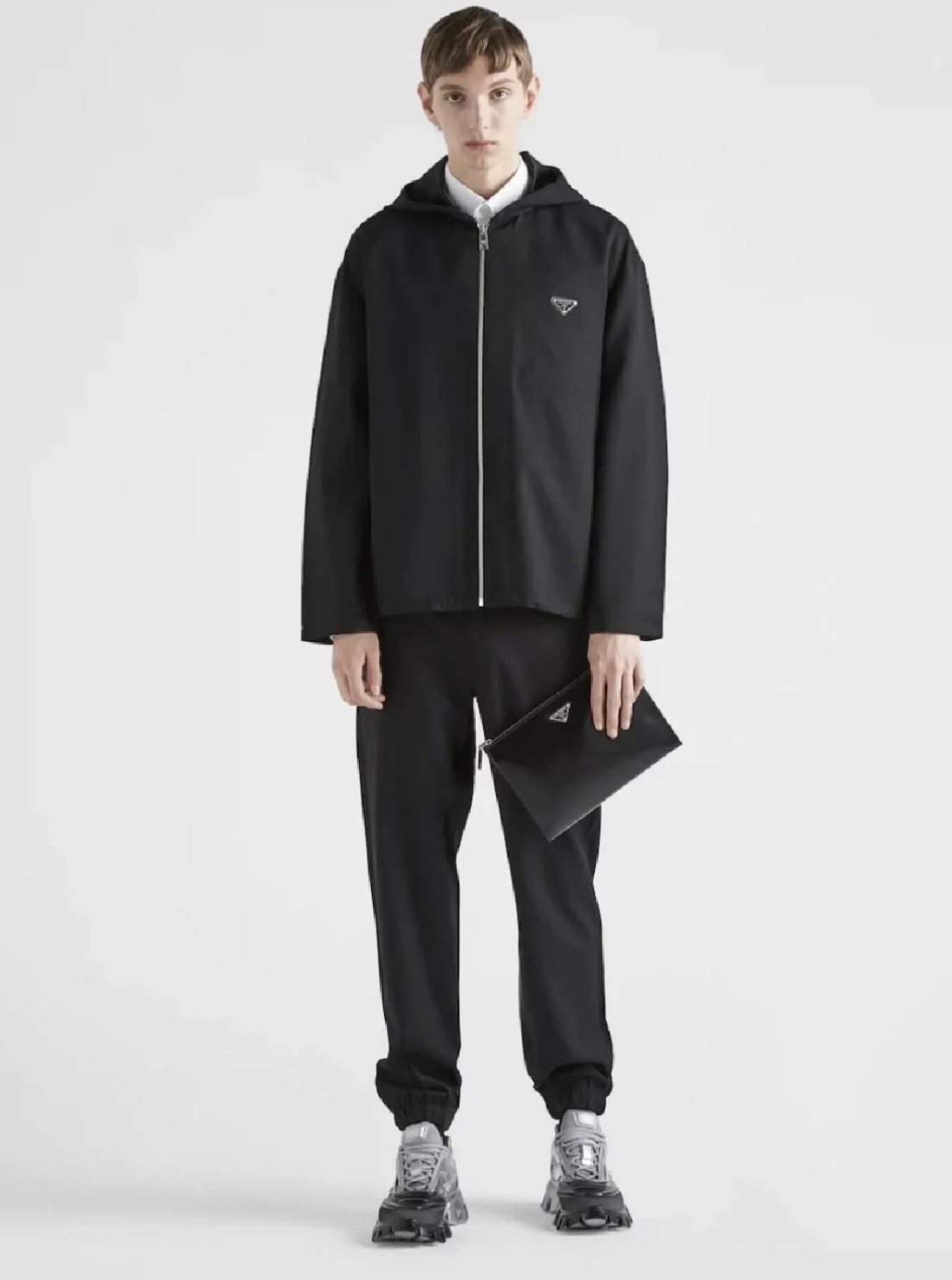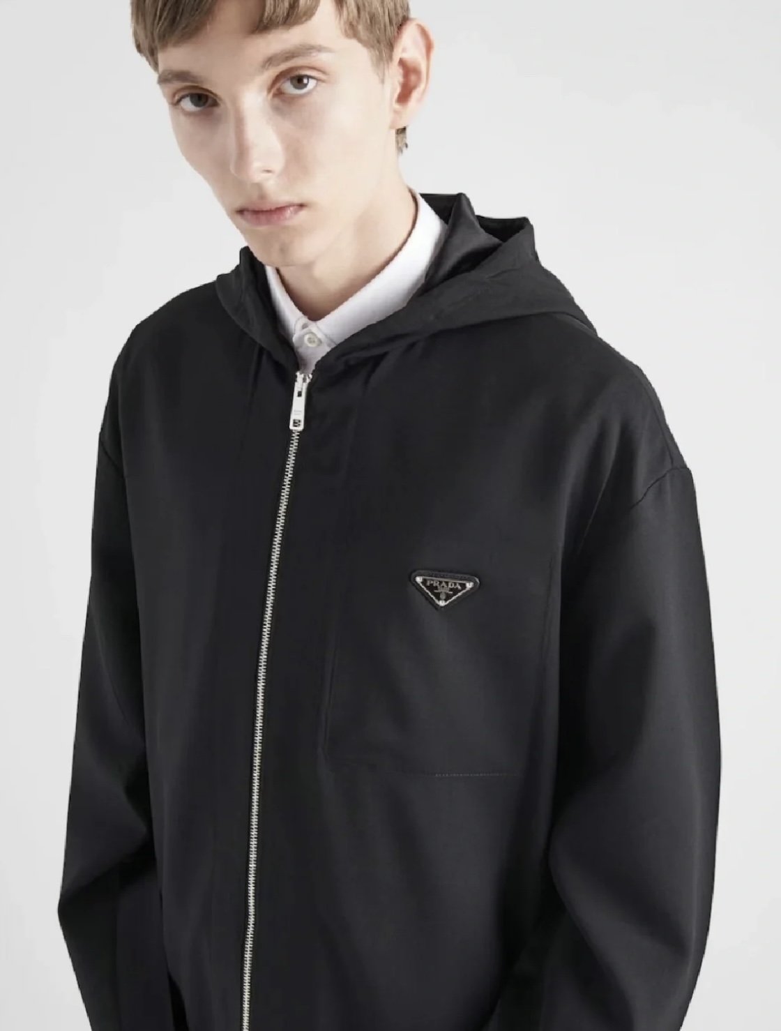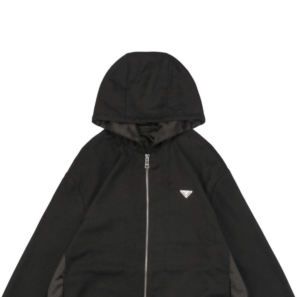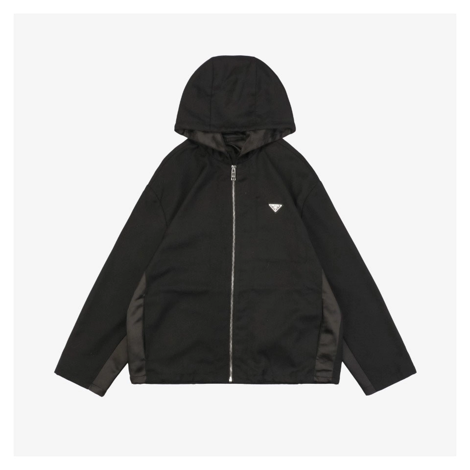 The Prada Triangle Logo Patchwork Zip-Up Hooded Jacket is meticulously stitched with selected fabrics to create a rich sense of layering and unique visual effects. Its front zip design is easy to wear and remove, while it is paired with adjustable drawstring hoods that enhance practicality and street style. The left chest is decorated with a classic triangular logo that shows luxury. The cuffs and hems are designed to be flexible and tight, ensuring comfort and fit when worn.