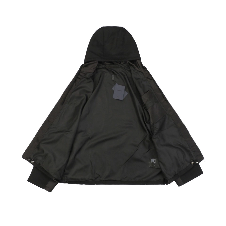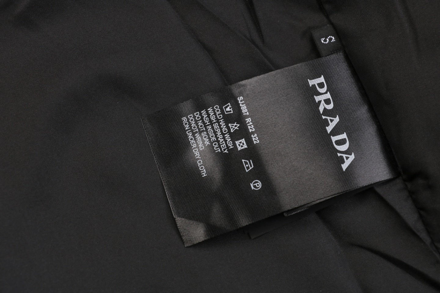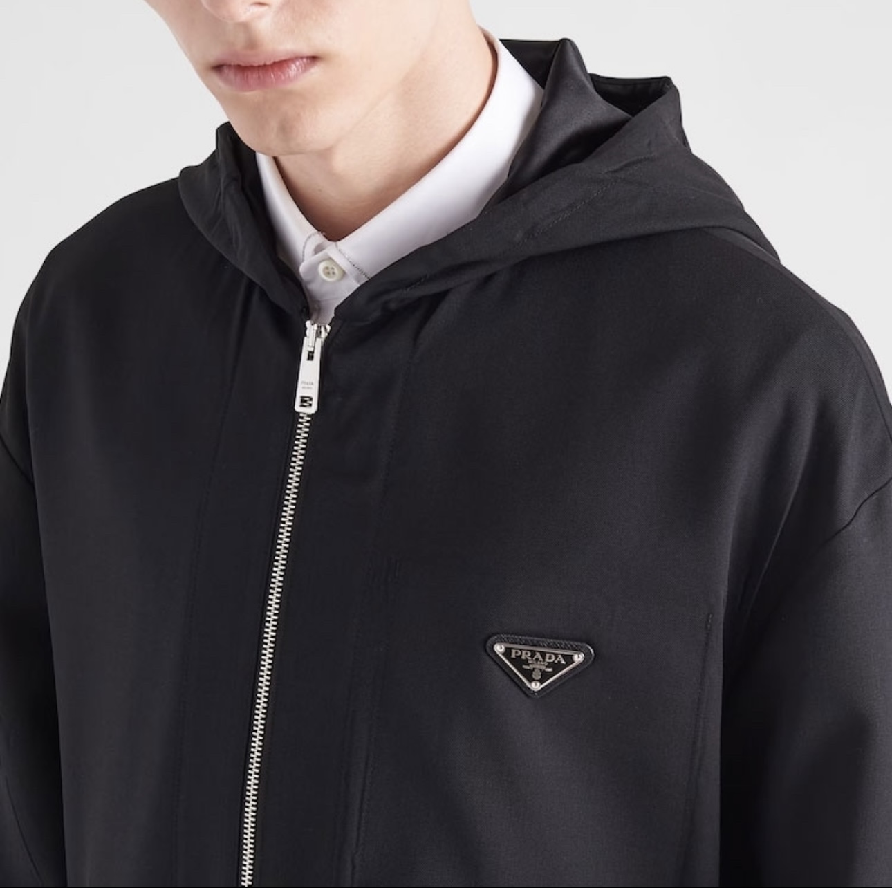 The Prada Triangle Logo Patchwork Zip-Up Hooded Jacket is meticulously stitched with selected fabrics to create a rich sense of layering and unique visual effects. Its front zip design is easy to wear and remove, while it is paired with adjustable drawstring hoods that enhance practicality and street style. The left chest is decorated with a classic triangular logo that shows luxury. The cuffs and hems are designed to be flexible and tight, ensuring comfort and fit when worn.