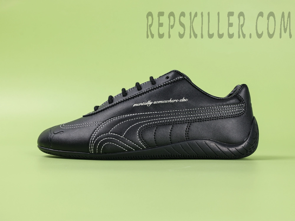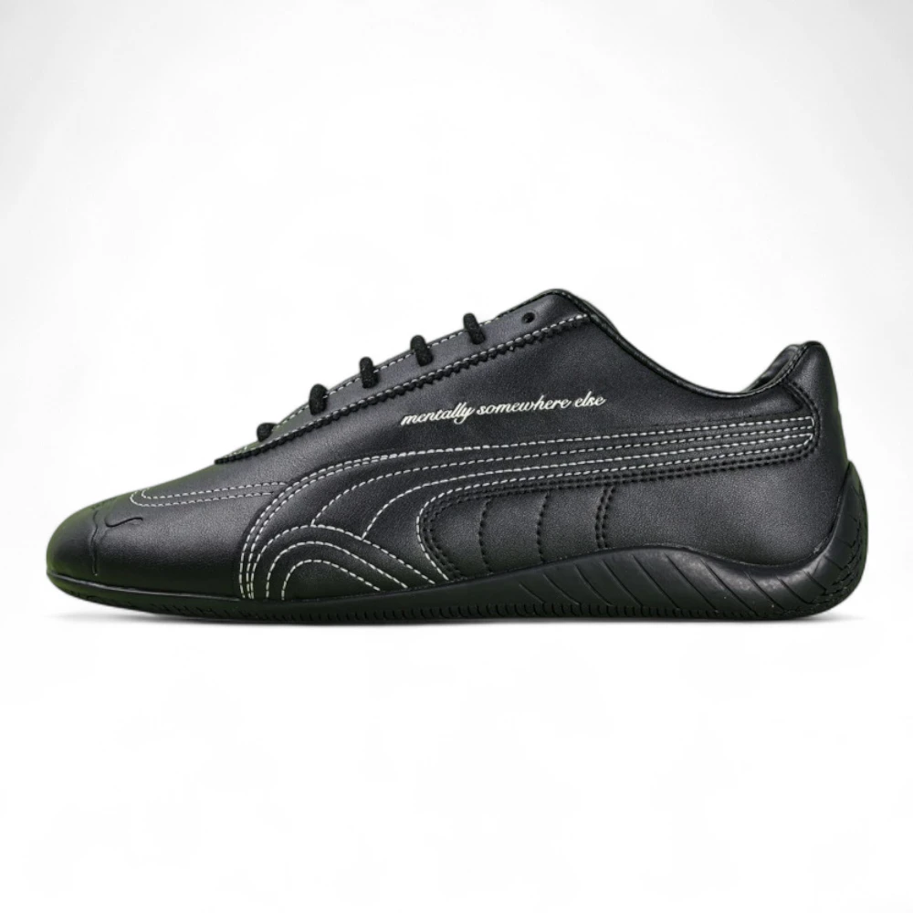 Puma Speedcat x NOAFTERNO “Mentally Somewhere Else” Black brings an introspective twist to motorsport-inspired design. Dressed in sleek black leather, this model blends racing heritage with a rebellious message embroidered in script along the upper. With streamlined curves, tonal rubber outsole, and stitched details, it’s a low-profile sneaker built for speed and statement. Perfect for those who drift between worlds.