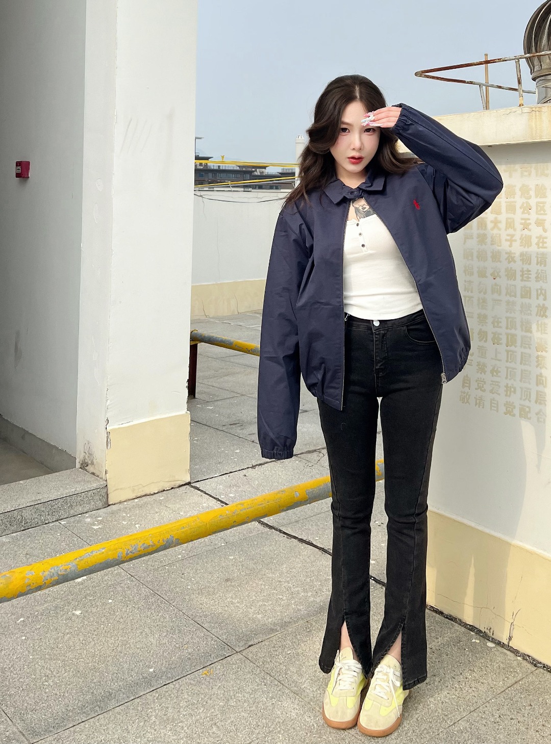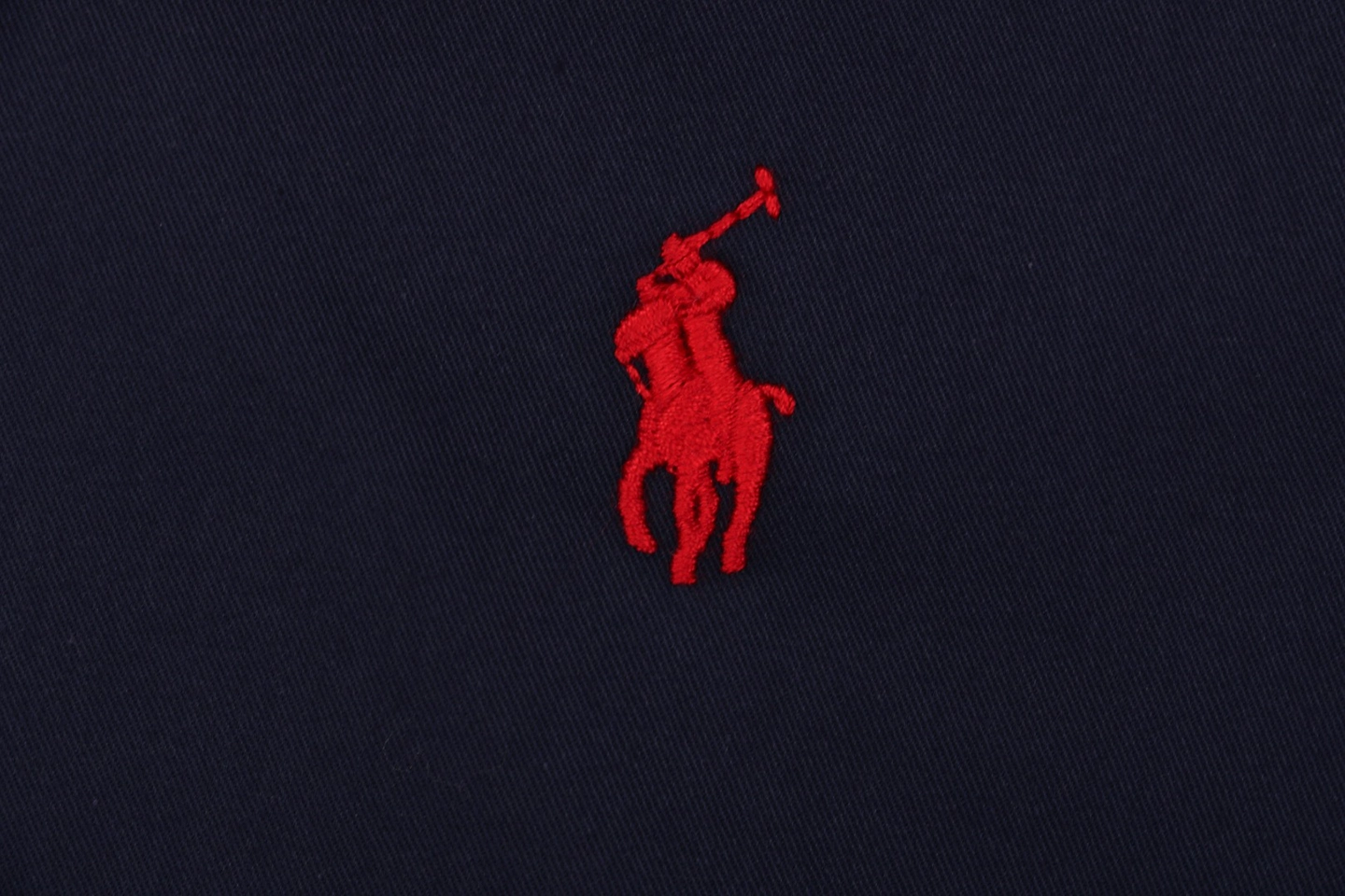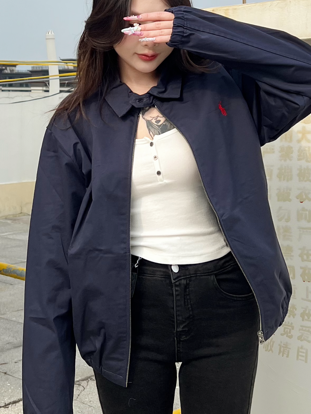 The Ralph Lauren Pony Logo Zip-Up Jacket offers a timeless casual outerwear option crafted from durable cotton-blend fabric. Designed with a relaxed fit, it features a full front zip, elastic hem and cuffs for a secure fit, and practical side pockets. The chest is embroidered with the iconic pony logo in contrast stitching, available in beige with navy embroidery or navy with red embroidery. A versatile piece that blends classic prep style with everyday comfort.