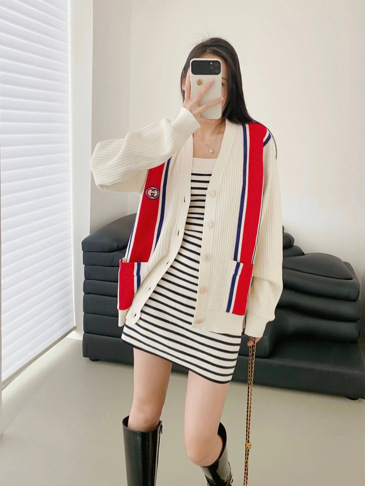 The G Red and Blue Web Jacquard Knit Cardigan Jacket is made of 85% cotton, 10% cashmere and 5% spandex. The yarn uses the original dyeing process to ensure the purity and durability of the color. After meticulous customization, all yarns undergo a twisting process to ensure that their slenderness and hardness are consistent with the original. The fabric that is woven is then stitched by hand to ensure the precision and elegance of each needle and line. Finally, the jacket was washed and reinforced to make it more durable and stylish. At the same time, the 7 stitching process makes the yarn texture clearly visible, showing a unique texture and level of texture.