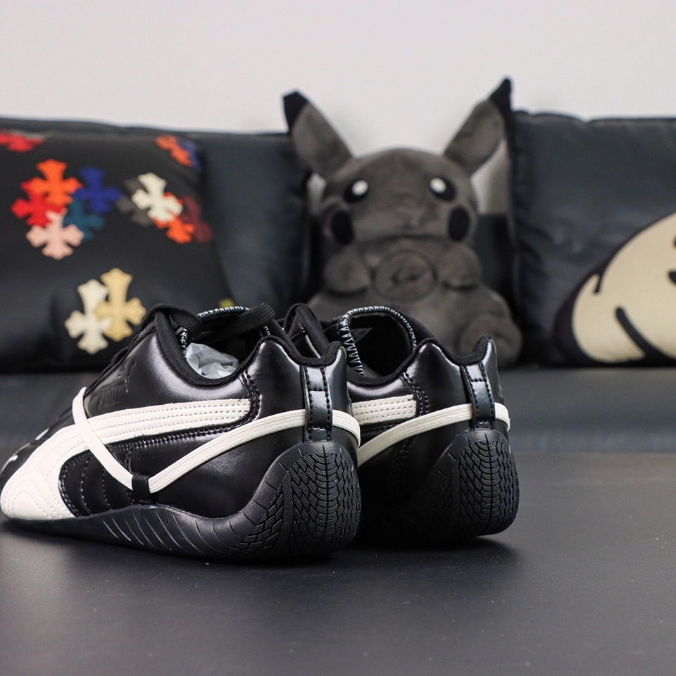 The Rosé x Wmns Speedcat Premium ‘Black’ reimagines PUMA’s iconic motorsport silhouette with elevated elegance and edgy flair. The sleek black leather upper is accented by an off-white Formstrip, while a unique secondary wraparound lacing system adds avant-garde sophistication. Zigzag exposed stitching runs along the tongue, where a dual-branded Rosé x PUMA leather tag sits proudly. Designed for both visual impact and performance, the sneaker rests atop a rounded rubber outsole tailored for low-profile traction and everyday versatility.