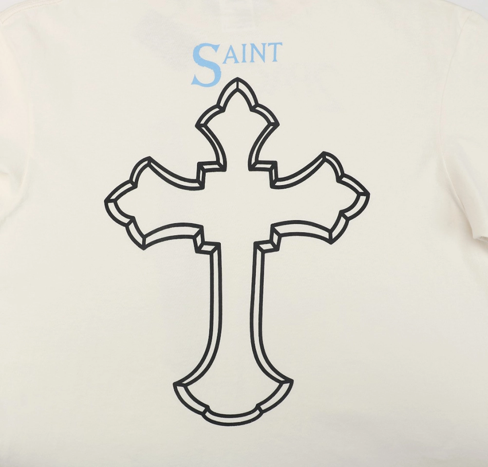 The Saint Michael 2PAC Cross Portrait Print T-shirt pays homage to the legendary rapper 2PAC with a minimalist side portrait graphic on the front. The back features a large outlined cross design paired with a subtle “SAINT” text in blue, blending streetwear with spiritual motifs. Crafted from premium washed cotton, the tee offers a soft, vintage feel ideal for everyday wear.