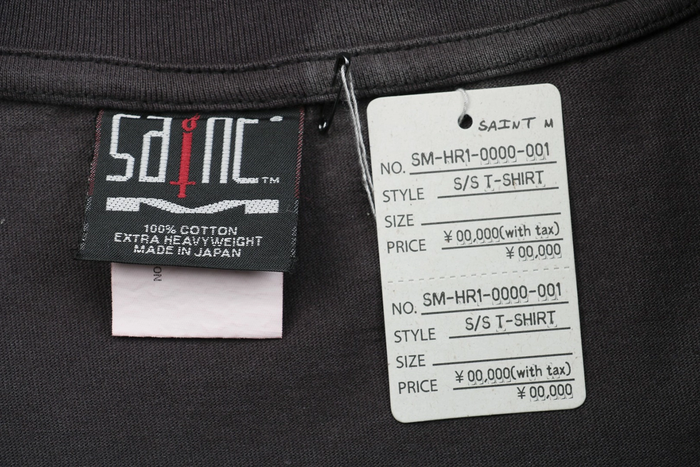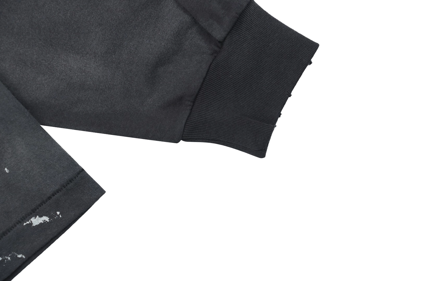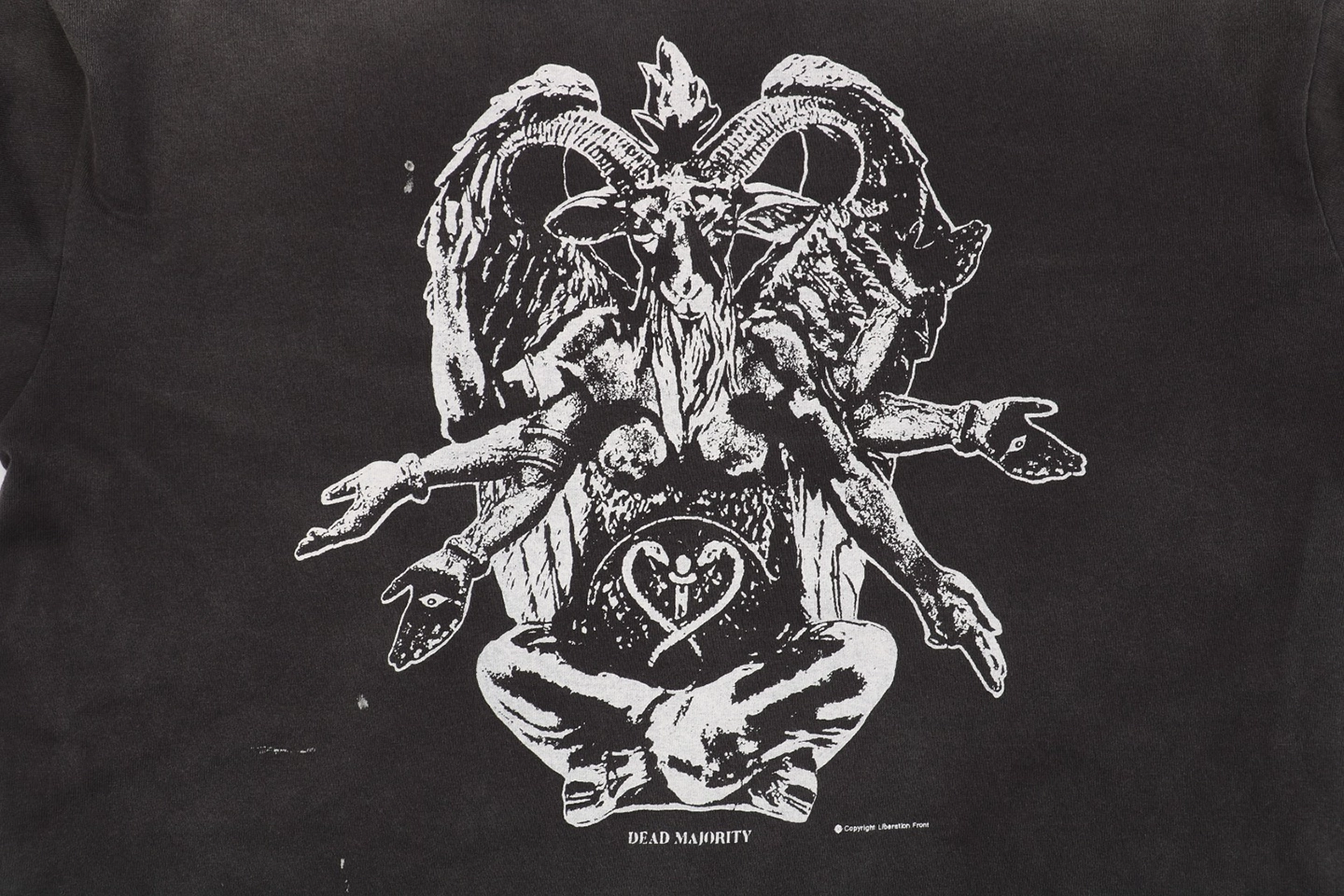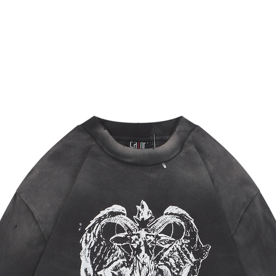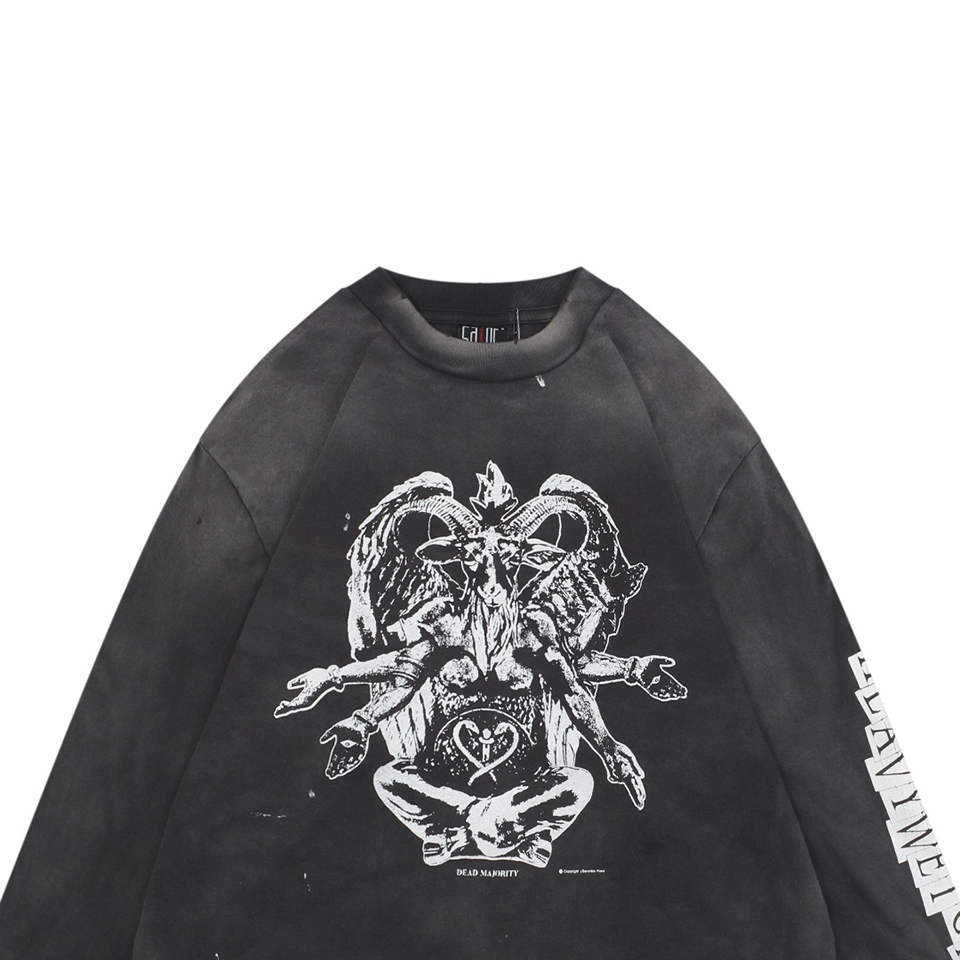 The Saint Michael Baphomet Devil Graphic Distressed Shirt is crafted from 260g 100% cotton with a 16s double-yarn French terry structure, woven on a tubular knitting machine with zero side seams for enhanced comfort and a more authentic vintage fit. The garment undergoes Asuté dyeing and KMnO₄ spray fading, creating a signature Saint Michael aged finish with natural-looking frost-like gradients. The large Baphomet graphic is printed using high-precision imported digital direct-injection machines, delivering sharp detail, accurate color separation, and long-lasting durability protected by a clear coating layer. Hand-applied distressing, including collar and cuff grinding and multiple tear marks, recreates authentic high-end vintage wear. Completed with heritage single-needle hem stitching and full custom branding, this oversized long sleeve is a standout high-street piece with strong visual impact.