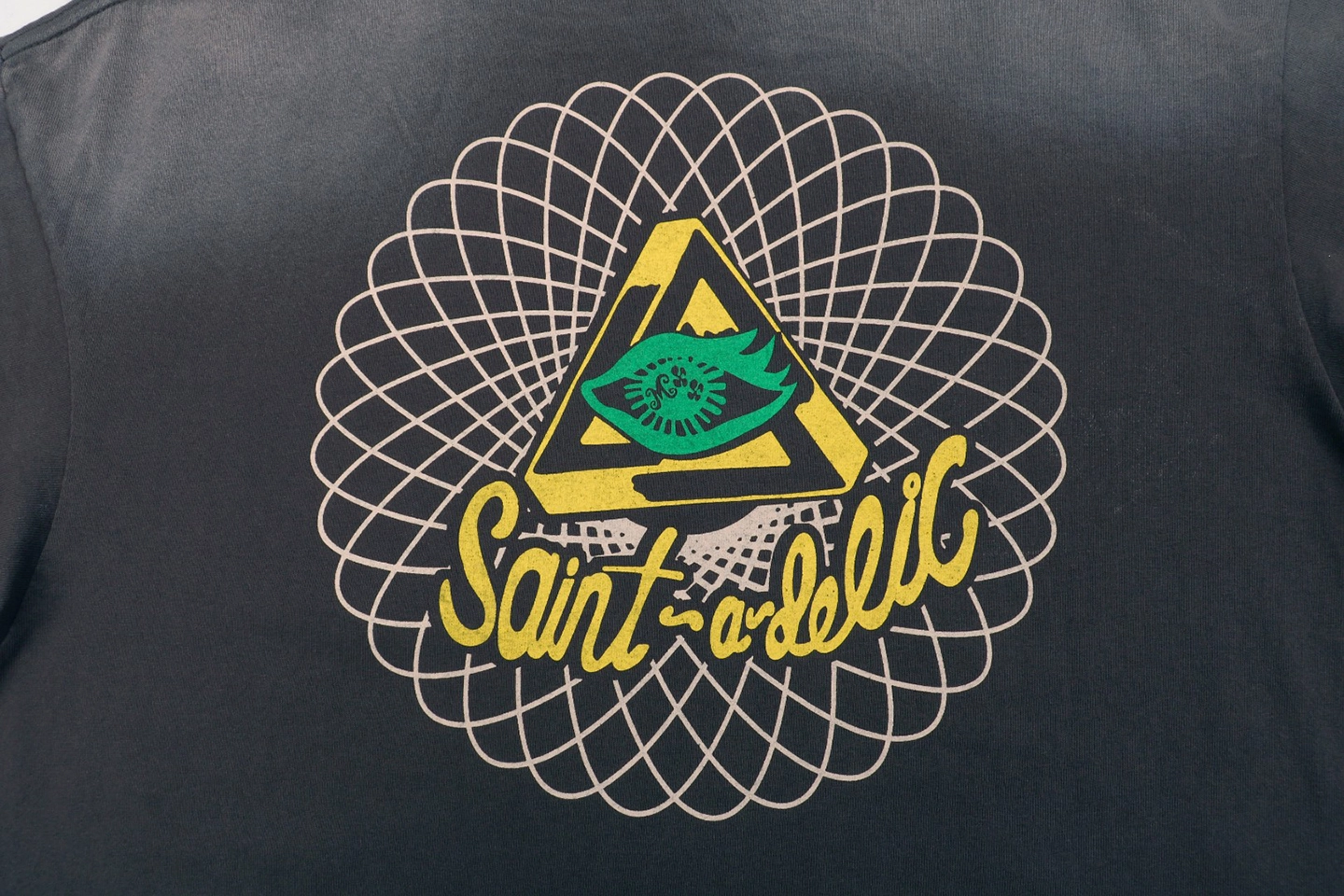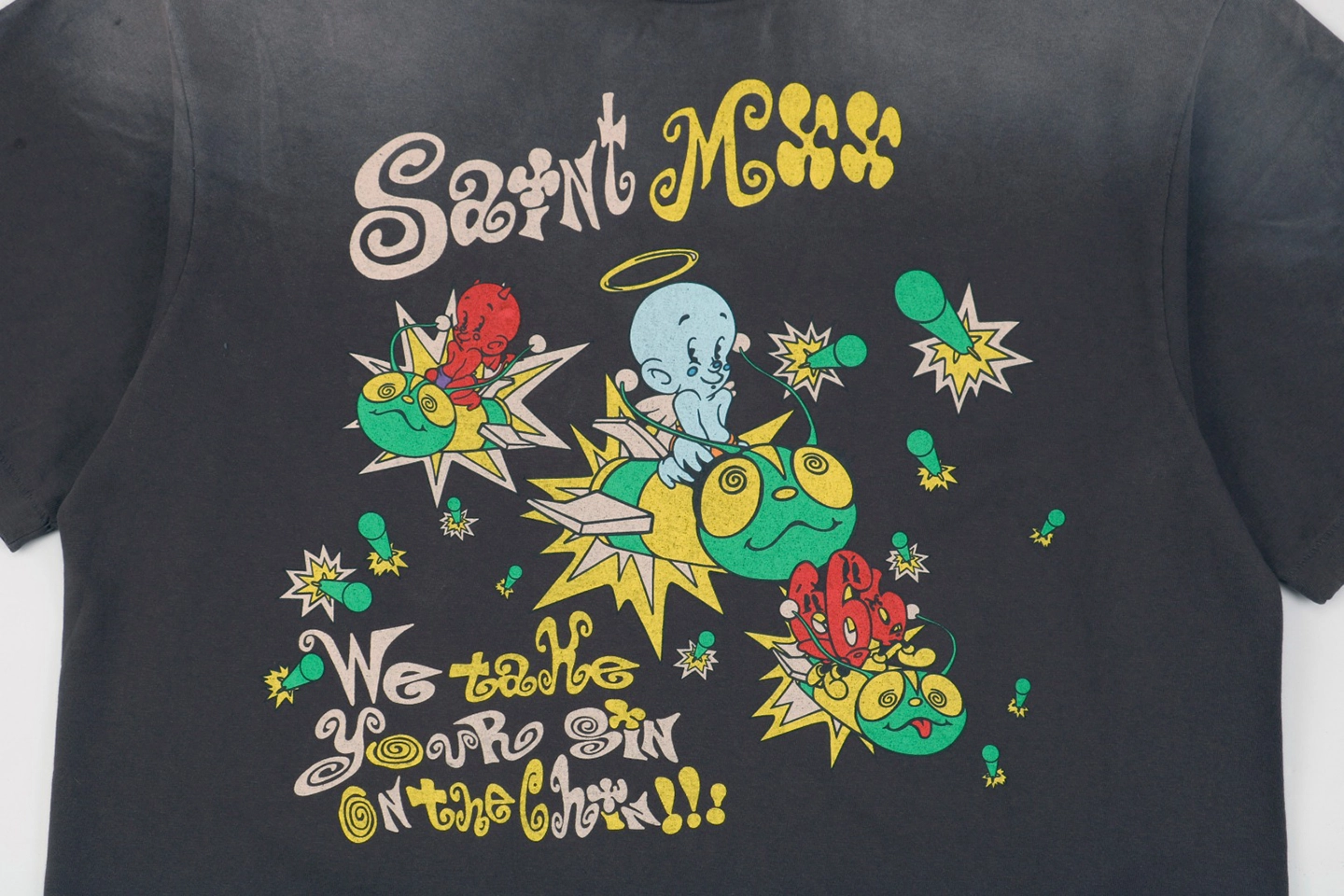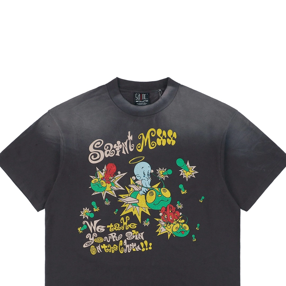 The Saint Michael Devil Bee Graphic T-shirt is a bold statement piece crafted in heavyweight washed cotton, delivering a vintage texture with street-style edge. The front features colorful cartoon-like devils and bees with explosive motifs, while the back showcases a psychedelic triangle eye symbol surrounded by a radial geometric pattern and the Saint Michael logo. Designed with an oversized silhouette, this tee balances rebellion and art with a distinct counterculture flair.