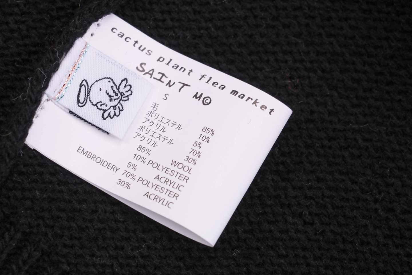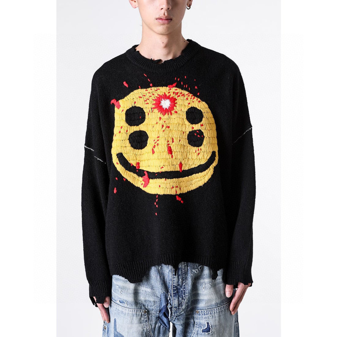 The Saint Michael Four-Eyed Smiley Hand-Embroidered Crewneck Sweater is a blend of 85% wool and 15% polyester, crafted in 357 jacquard stitches. The yarn color design of the sweater is ingenious, not a single black, but with a slight vintage tone. The middle pattern is made with a dyed yarn, and the same color thick yarn is hand-stitched horizontally at the top to enhance the sense of detail. At the same time, the front and back covers of the sweater also use extensive hand embroidery.