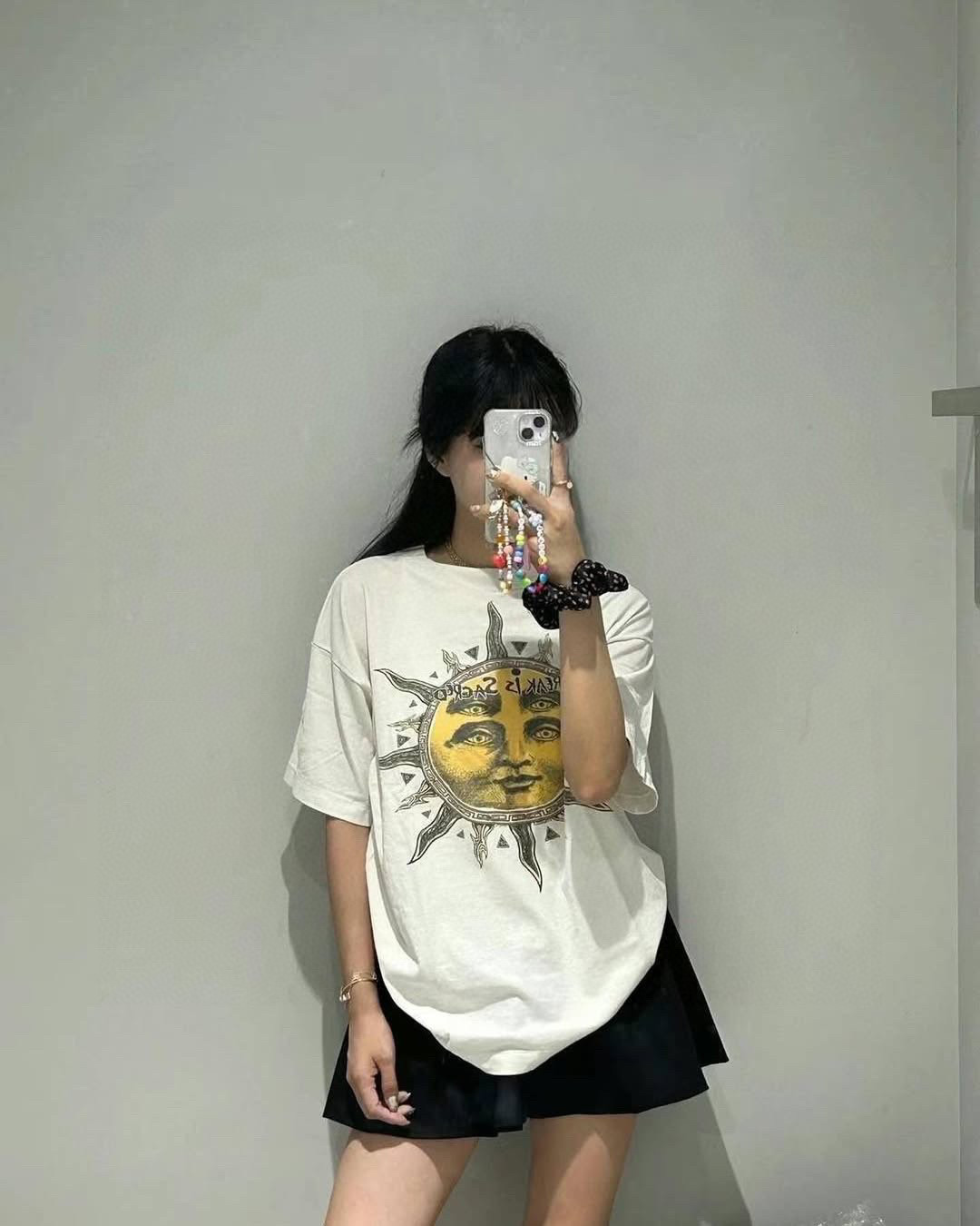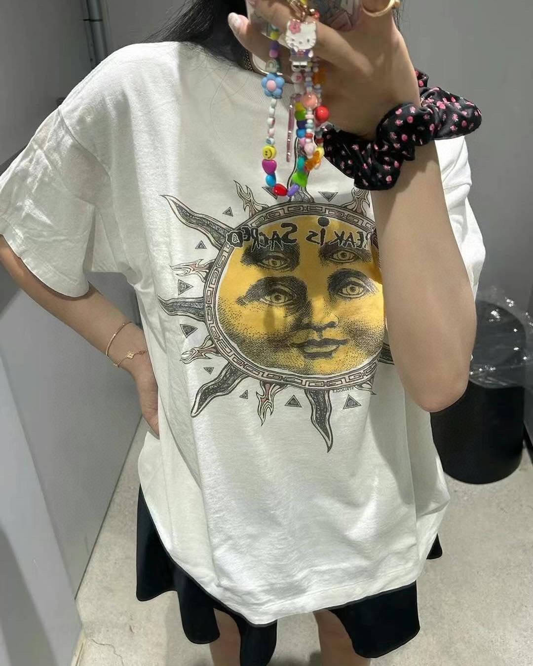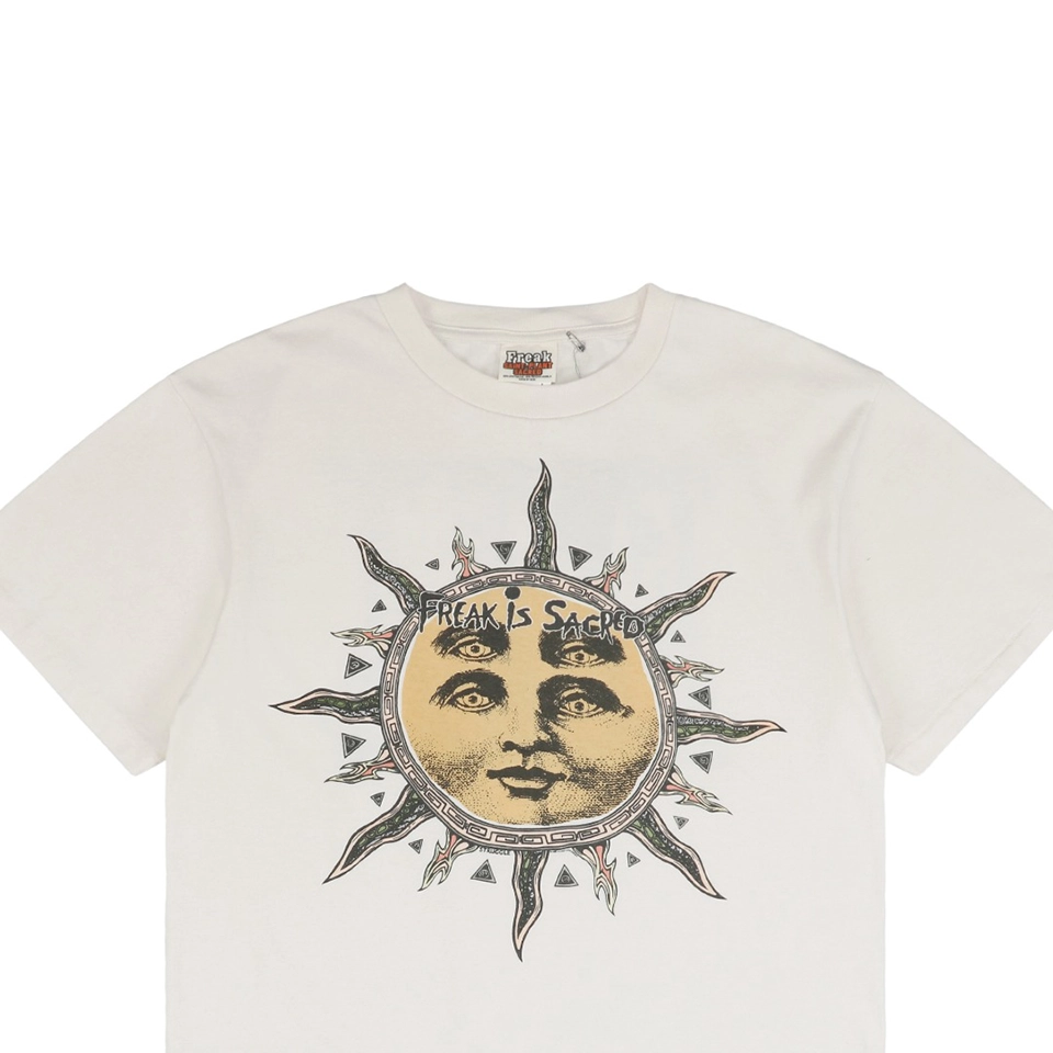 Saint Michael Four-Eyed Sun Print T-Shirt delivers a surreal and symbolic graphic featuring a distorted sun with four eyes, blurring the lines between mysticism, rebellion, and visual art. The design suggests heightened perception and inner awakening, aligned with Saint Michael’s spiritually charged narrative. With a vintage-inspired faded print and soft cotton body, this oversized tee offers both philosophical depth and street-ready edge—a perfect piece for those who wear their beliefs.
