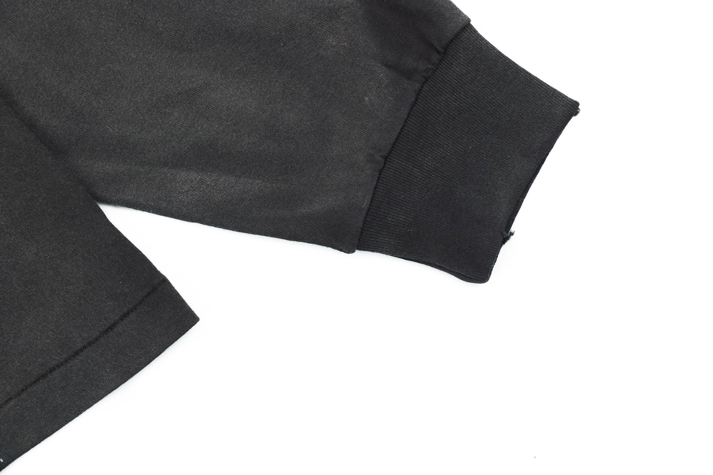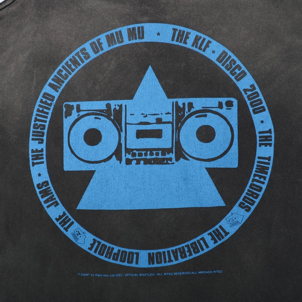 The Saint Michael KLF Graphic Vintage-Washed Shirt draws inspiration from high-street grunge aesthetics and authentic vintage wear. Crafted from 260g 100% cotton double-yarn French terry fabric, the garment is produced using a tubular knitting construction, meaning there are no side seams — providing a smoother silhouette, enhanced comfort, and a more authentic retro fit. After garment washing, the fabric weight increases to approximately 280g, giving the tee a dense, premium hand feel consistent with Saint Michael’s signature distressed style.