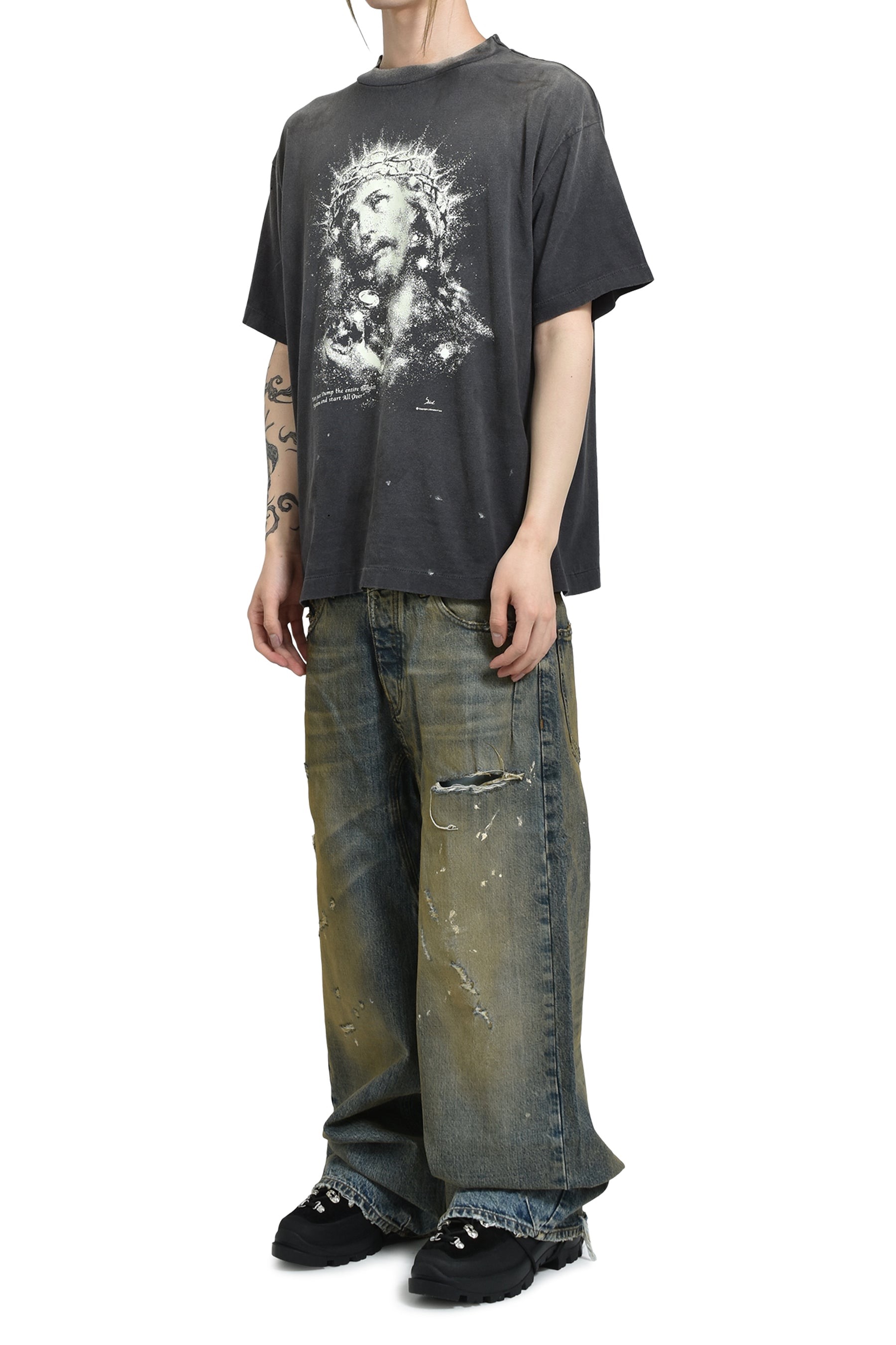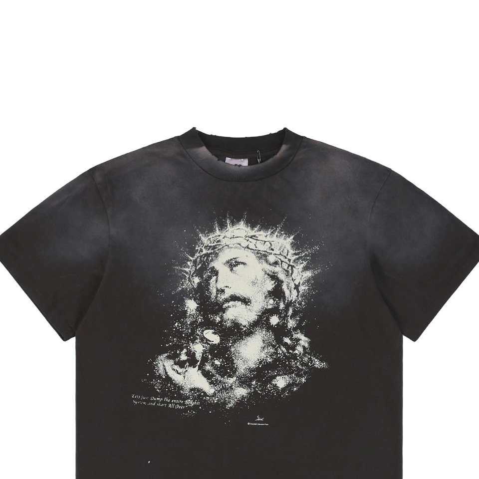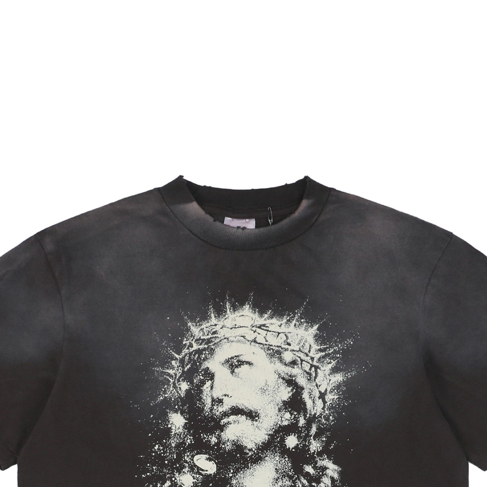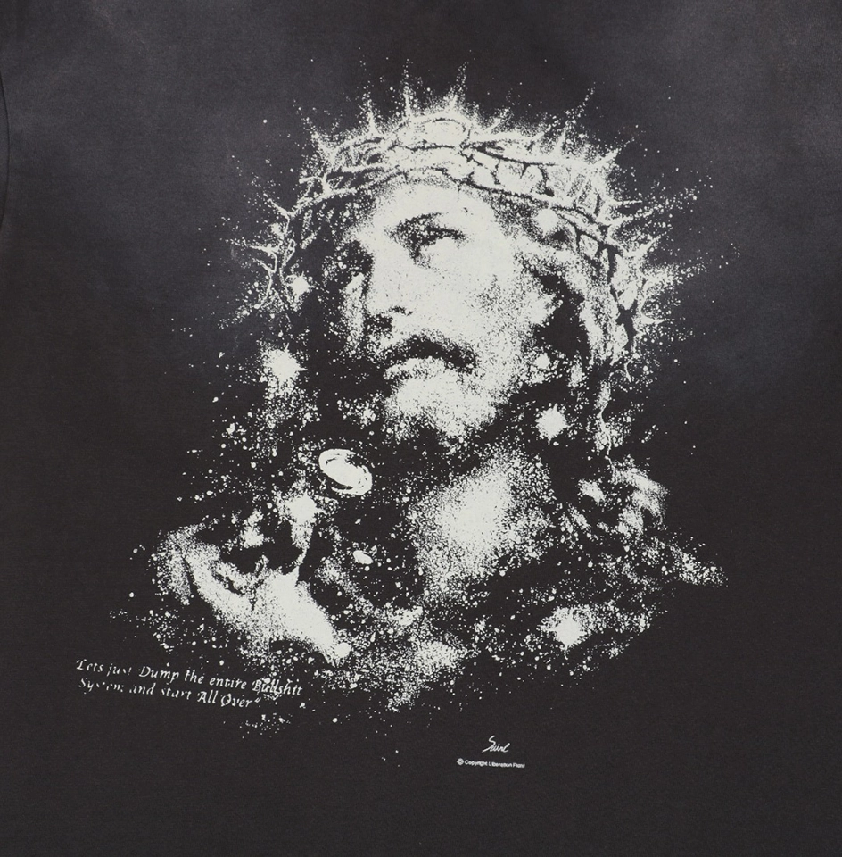The Saint Michael Luminous Jesus Crown of Thorns T-shirt presents a bold spiritual motif with a radiant depiction of Jesus wearing a crown of thorns, screen-printed with luminous ink for a glowing effect in low light. Crafted from premium heavyweight cotton, the tee is treated with a subtle vintage wash and punctuated by minor distressing to echo the brand’s raw and soulful aesthetic. This piece is both a visual statement and a testament to artisanal craftsmanship, bridging religious iconography with modern streetwear.