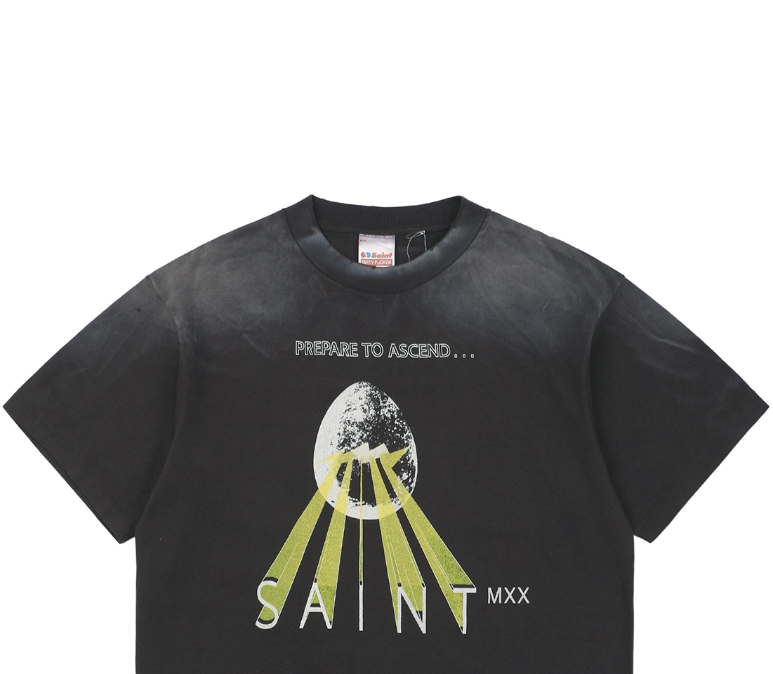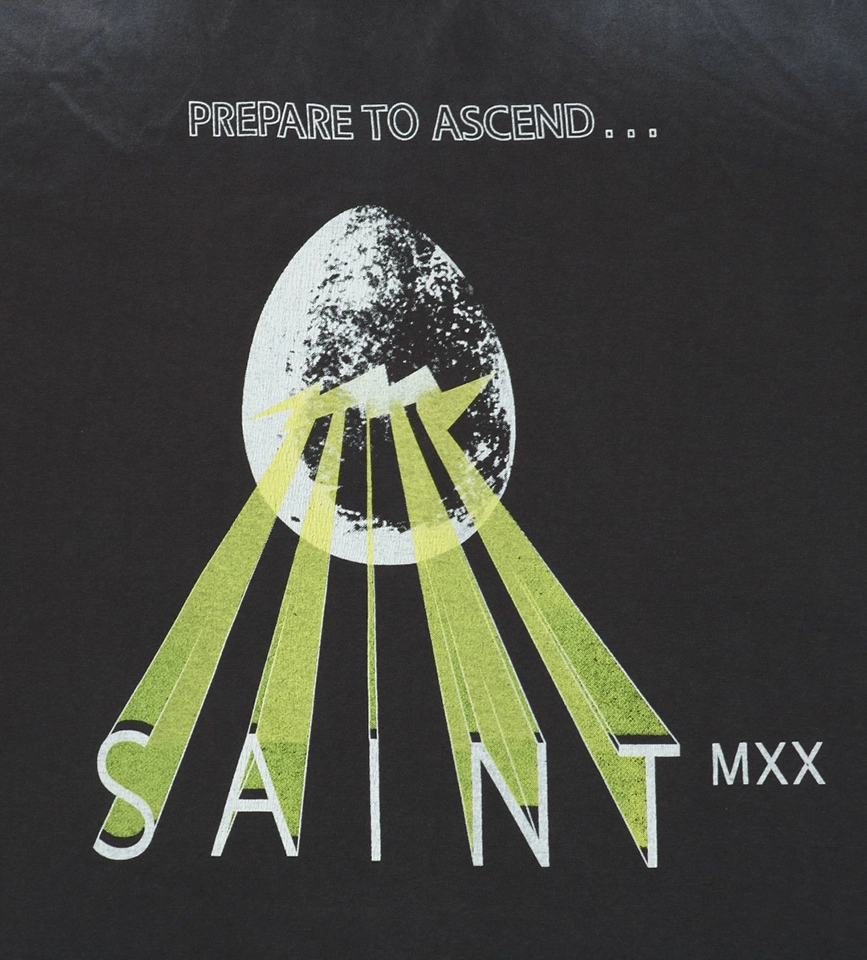 The Saint Michael “Prepare to Ascend” Egg Graphic T-shirt showcases a symbolic cracked-egg design illuminated by beams of light, merging themes of resurrection and transcendence. Crafted from heavyweight cotton, the tee’s washed black base adds a vintage texture, while subtle distressing enhances its lived-in appeal. “SAINT MXX” typography anchors the graphic, amplifying the brand’s spiritually infused aesthetic. This tee balances bold visual storytelling with everyday wearability.