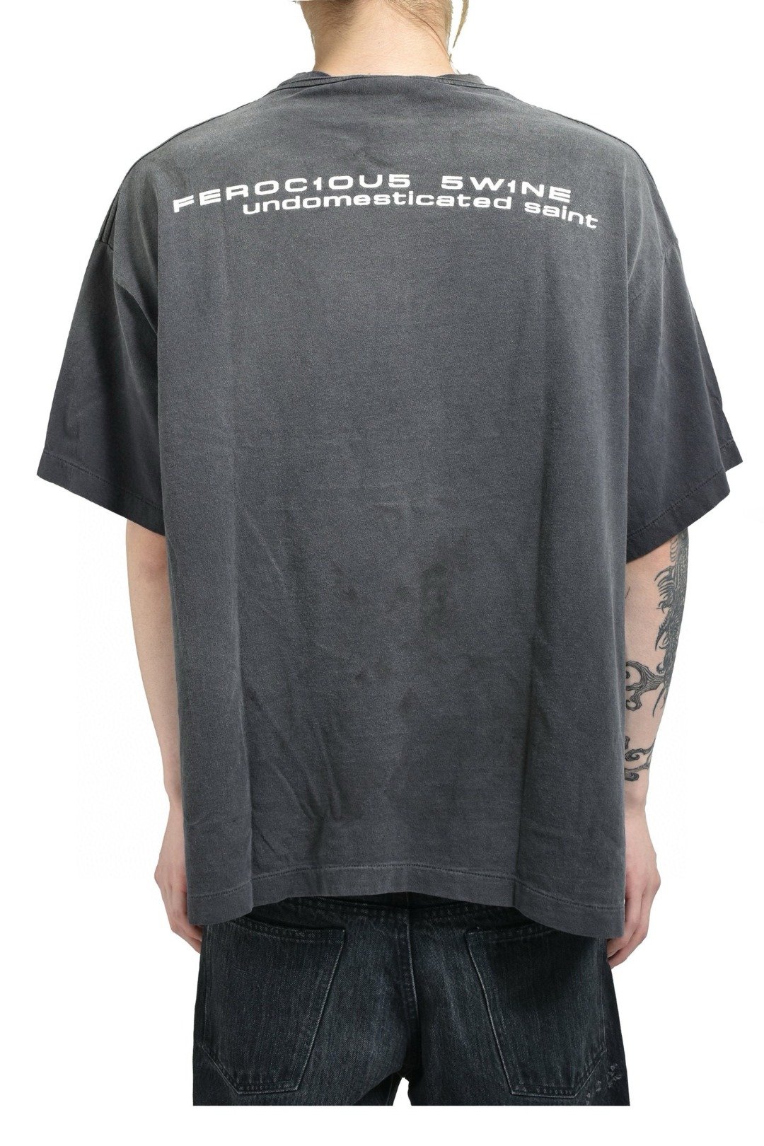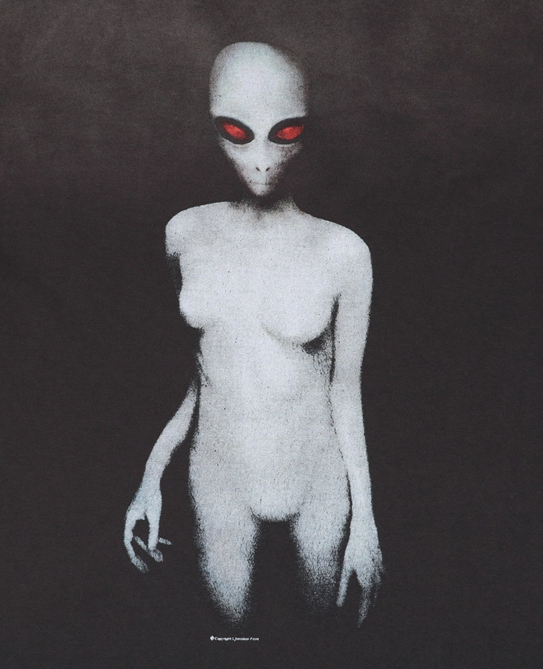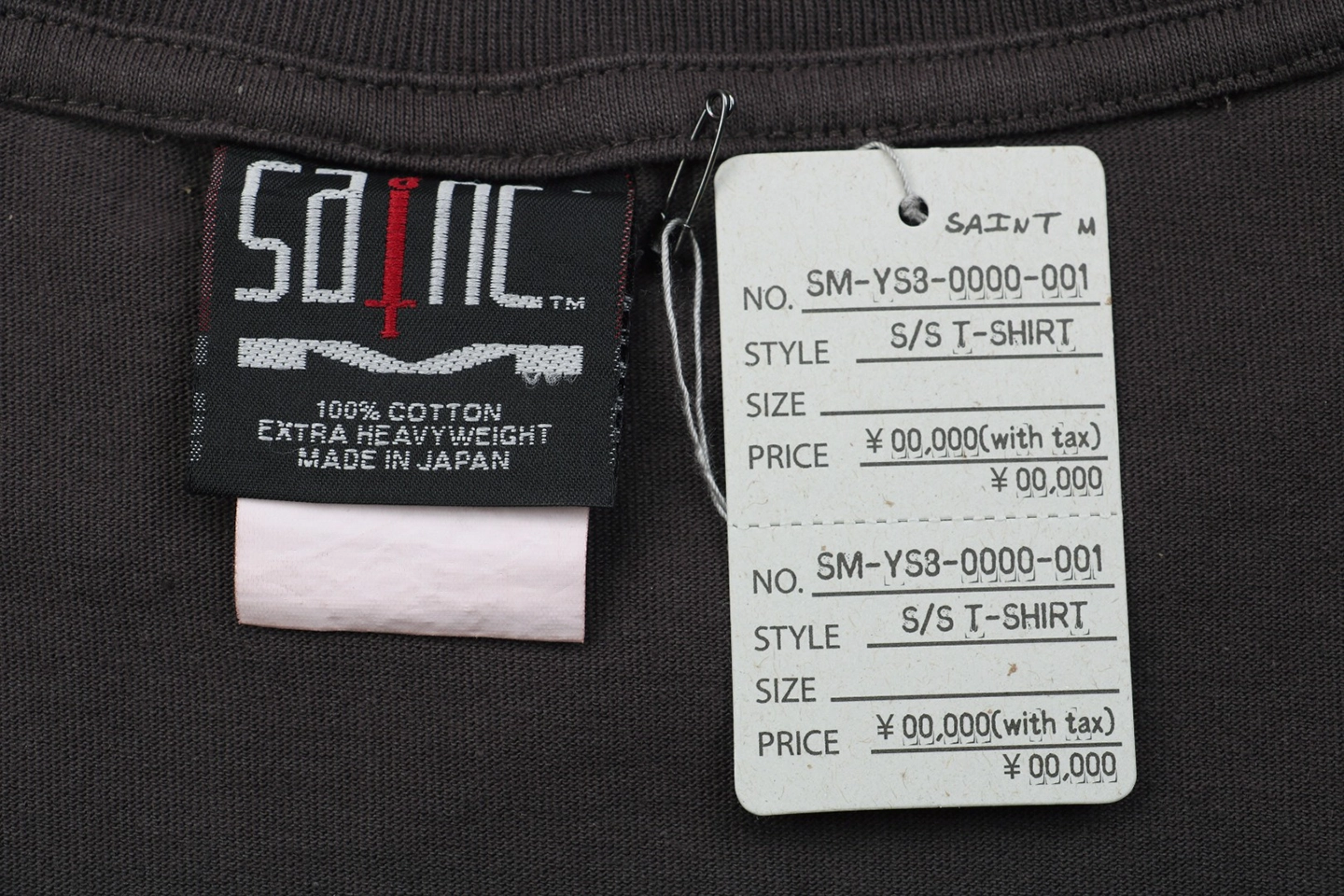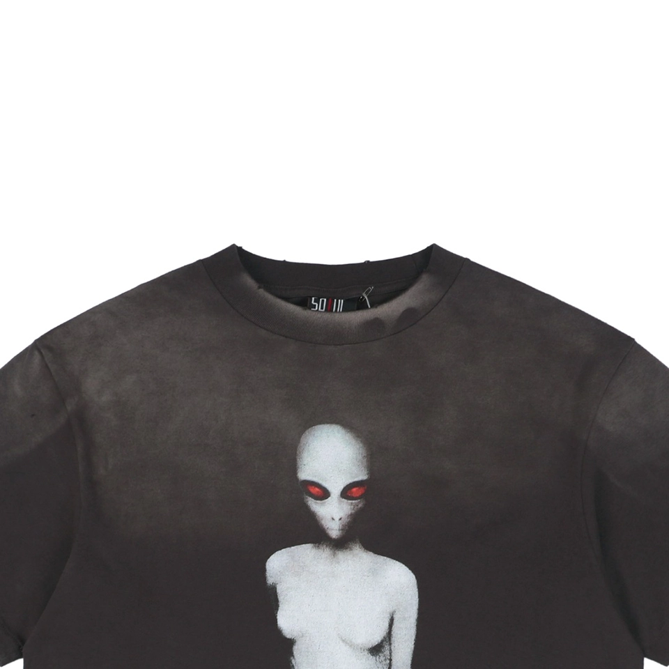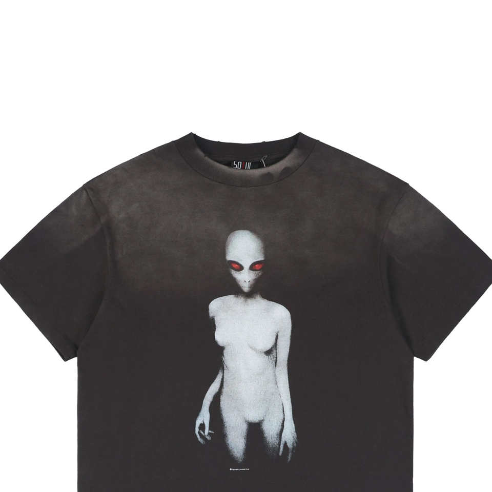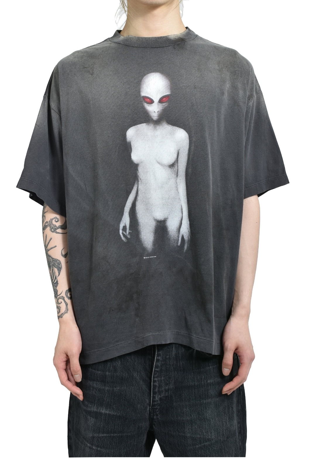 The Saint Michael Red-Eyed Alien Graphic T-shirt brings an avant-garde edge to streetwear, showcasing a haunting alien figure with piercing red eyes printed across the front. Crafted from premium cotton with a slightly faded black wash, the tee exudes a vintage-inspired character. The minimalist back print features sharp white typography, balancing the bold front graphic. Designed with a relaxed silhouette, this piece blends comfort with a distinctive visual statement, making it a standout choice for those who embrace unconventional style.
