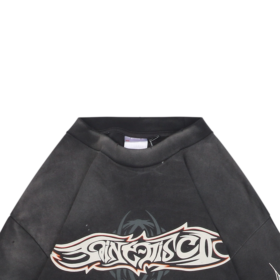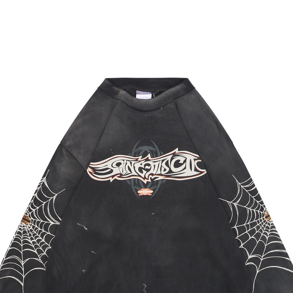 Handcrafted distressed details—including collar and cuff grinding, micro-holes, and thread-pulled aging—are paired with retro single-stitch hem construction. The large front and back spider web graphics are produced using imported high-resolution direct-injection printers, resulting in rich color, sharp lines, and clear fine text. A protective transparent coating ensures the print remains durable without compromising the vintage fabric texture.