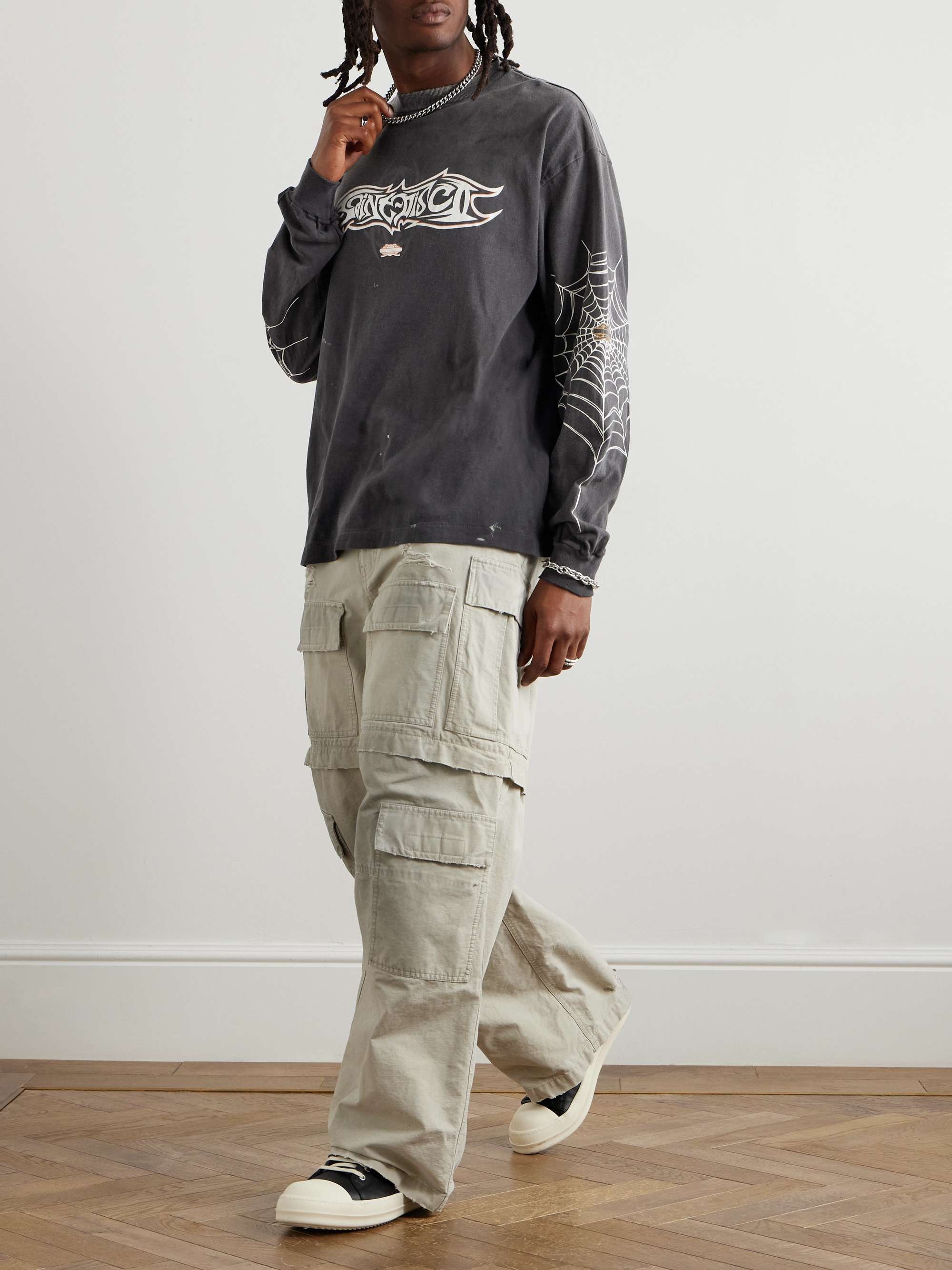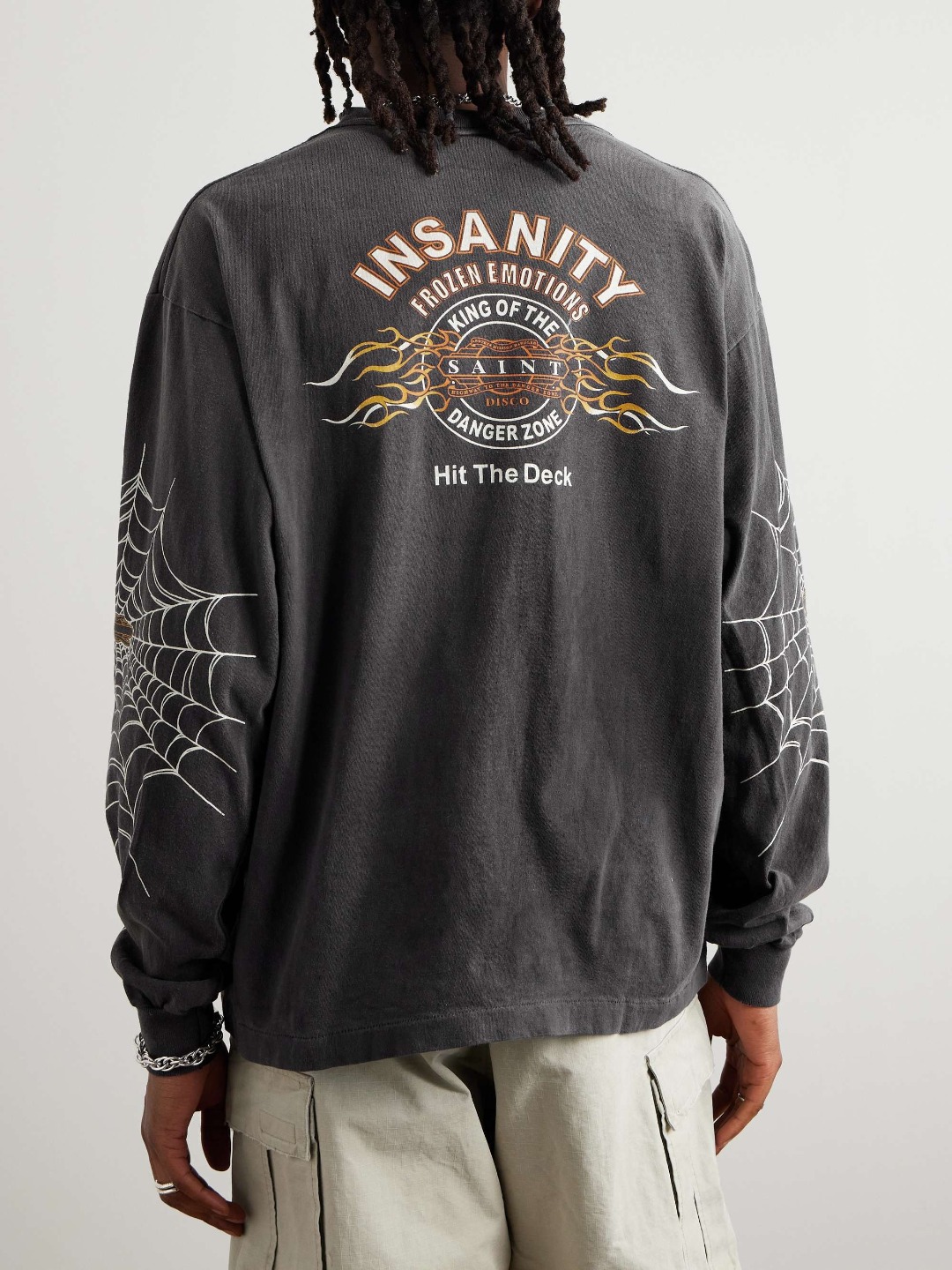 The Saint Michael Spider Web Vintage Wash Shirt is crafted from a 260g 100% cotton double-yarn French terry fabric, increasing to approximately 280g after garment washing for a heavier, more textured feel. Using a specialized circular knitting machine, the fabric is produced as a tubular knit with no side seams, improving comfort and delivering a clean, high-end silhouette true to Saint Michael’s original designs.