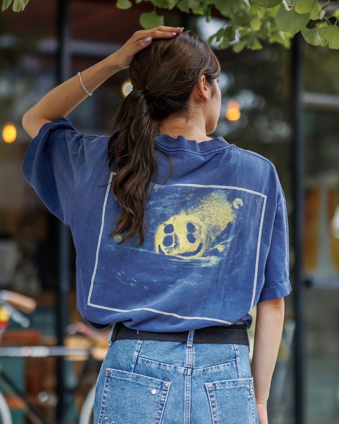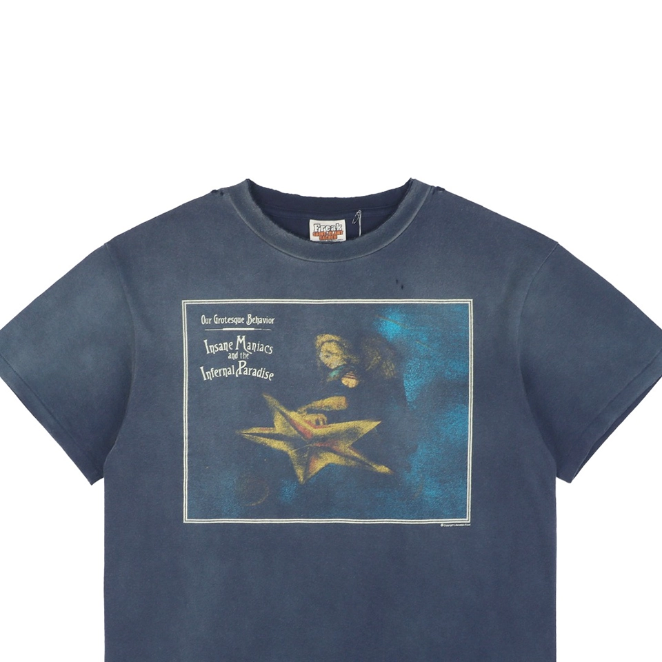 The Saint Michael Star Smiley Distressed & Destroyed Graphic T-Shirt juxtaposes childlike innocence with dystopian rebellion, featuring a sketch-style smiley face with star-shaped eyes as the central graphic. The piece is finished with faded wash, frayed edges, and strategic tears, emphasizing the contrast between hopeful joy and chaotic decay. Made from soft premium cotton in a relaxed fit, this tee captures emotional duality in a bold, street-ready silhouette.