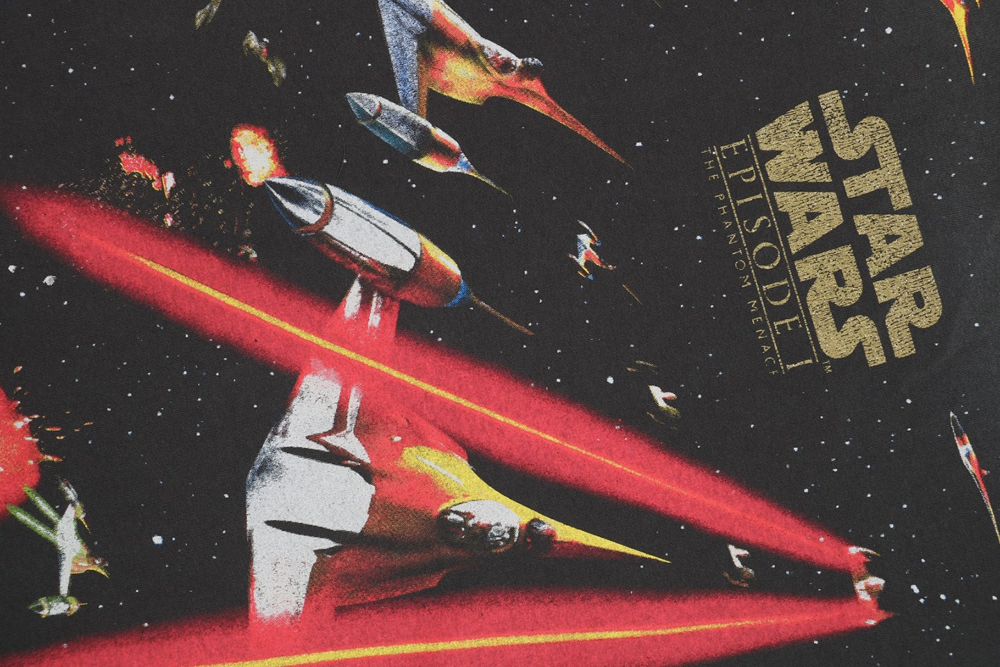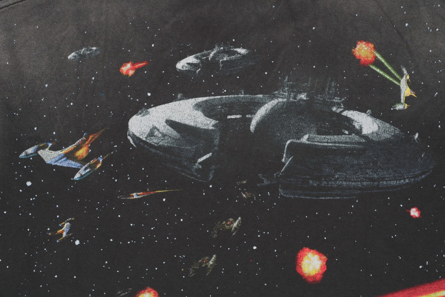 The Saint Michael Star Wars Galactic Battle Print T-shirt captures the intensity of space combat with an all-over front and back print inspired by Star Wars: Episode I. The richly detailed explosion effects and iconic starfighter formations create a visually dynamic centerpiece. Crafted from heavyweight washed cotton, the tee combines vintage character with bold cinematic expression.