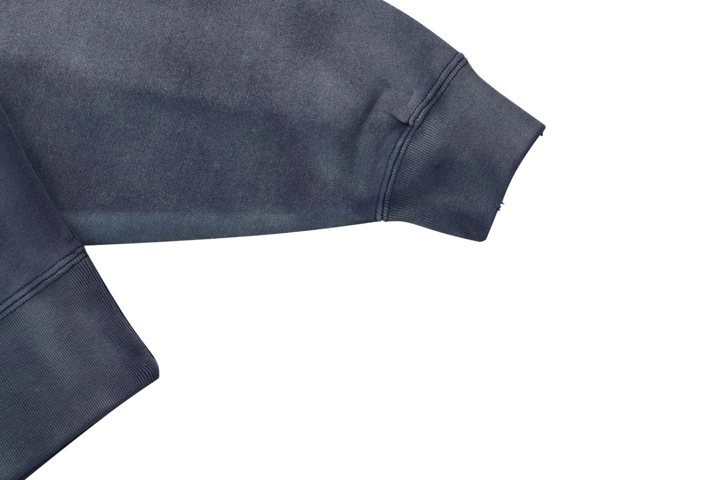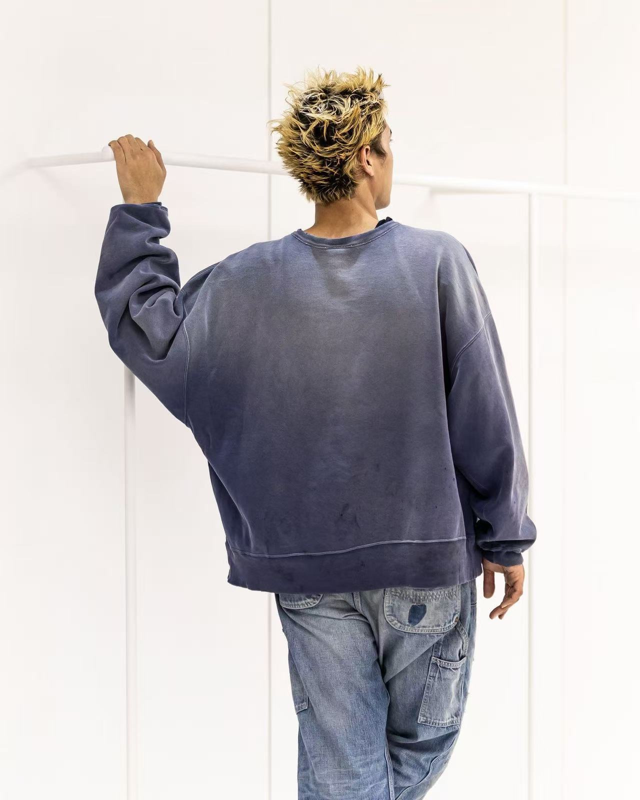 Using original Azurite dye and high-manganese spray distressing, the fabric develops natural discoloration, subtle abrasions, and authentic wear marks along the cuffs, hem, and body. The iconic heart-shaped “SAINT POWER” graphic is applied through a heavy wash print technique, resulting in fine cracking details that enhance the retro character while maintaining a soft, flexible hand feel.
