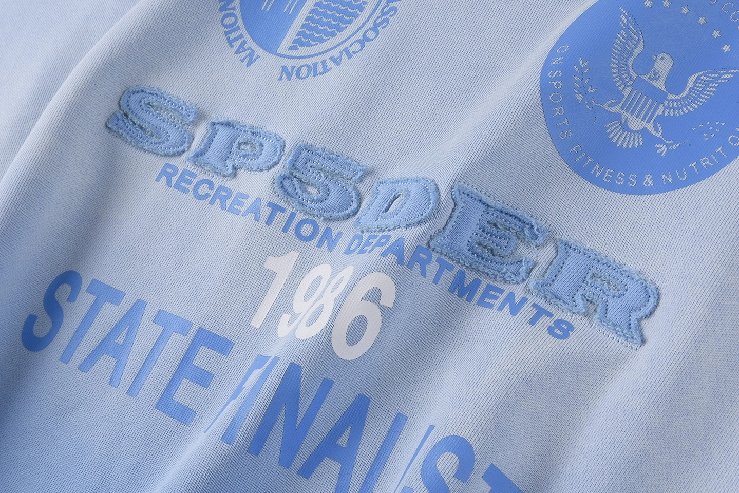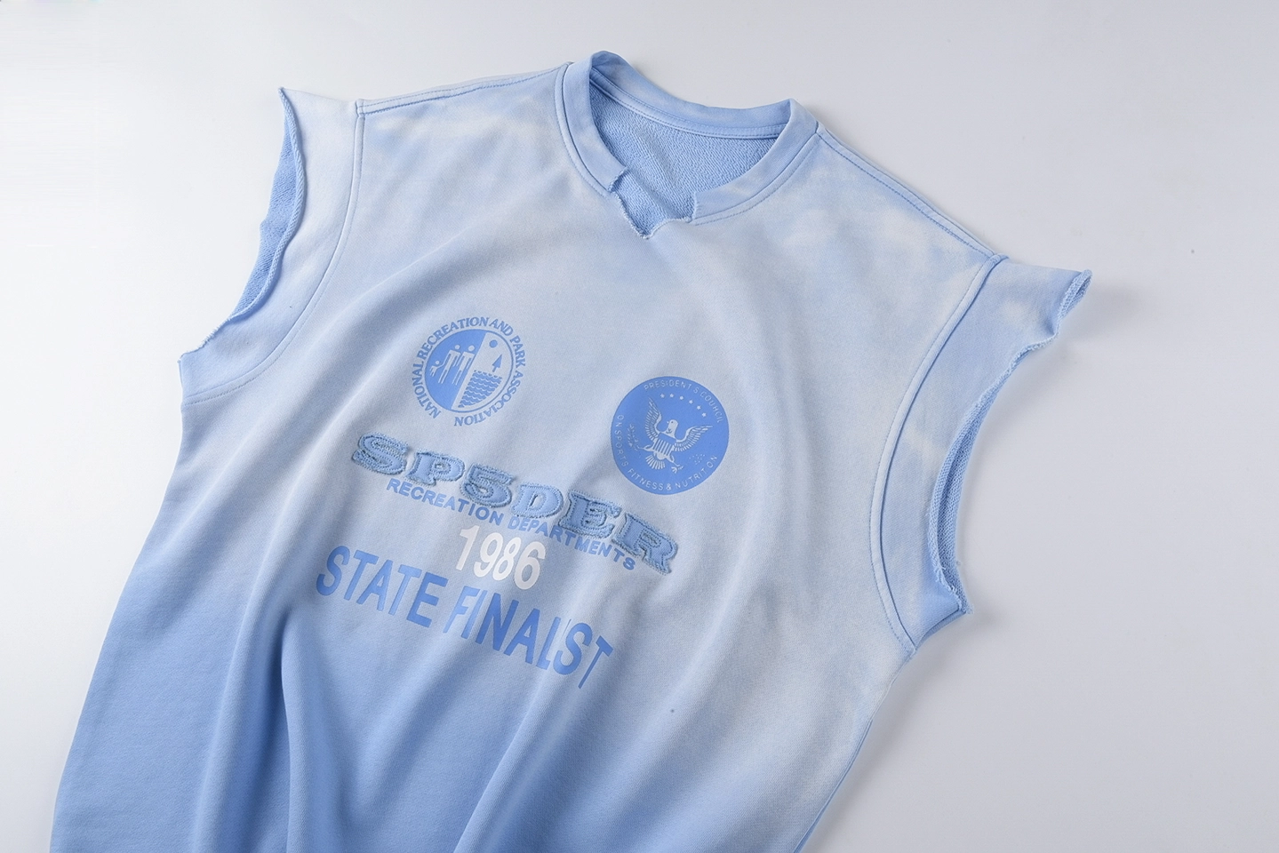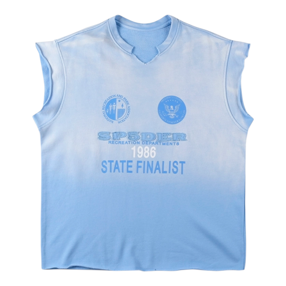 The Sp5der 1986 State Finalist Sleeveless Tee delivers a vintage athletic aesthetic with a modern streetwear twist. Designed in a soft sky blue gradient wash, this cut-off silhouette features raw sleeve edges and a slightly distressed neckline for a worn-in, retro feel. The front showcases layered collegiate-inspired graphics including “SP5DER Recreation Departments”, “1986 State Finalist”, and badge-style emblems, giving it a nostalgic sports department vibe. On the back, a bold horned emblem graphic sits across the upper panel, while a subtle “55” print near the hem adds a jersey-inspired finishing touch. The relaxed sleeveless cut enhances mobility and statement styling.