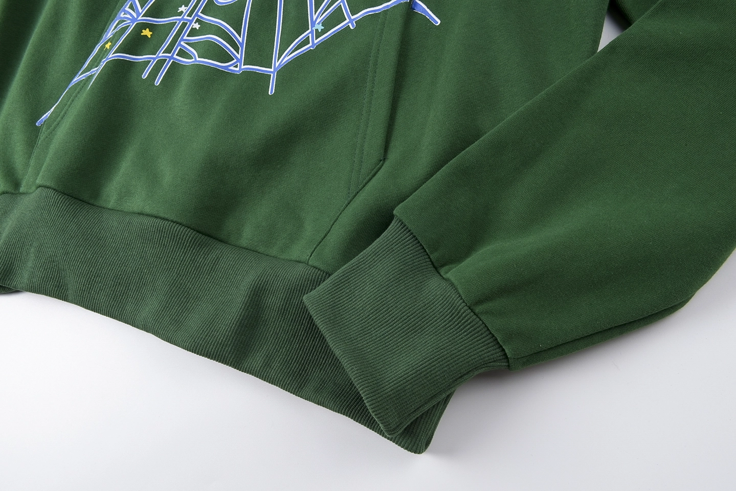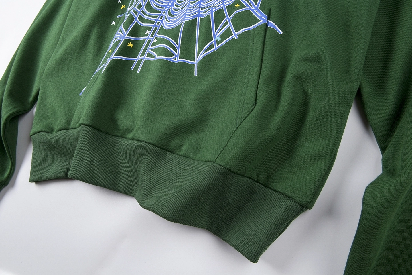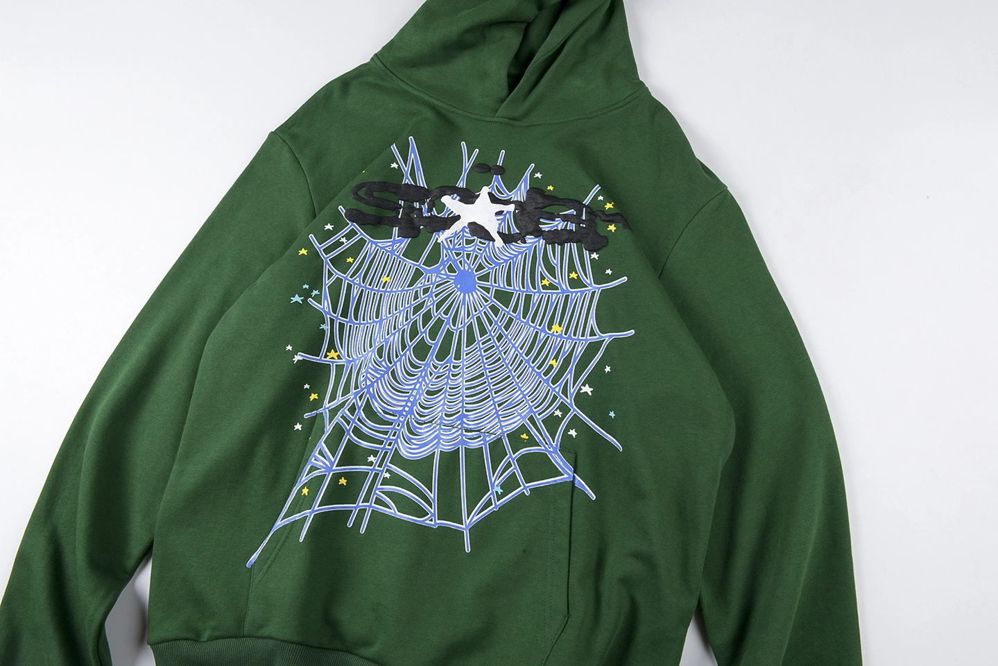 Crafted from midweight cotton fleece, the Sp5der 555555 Hunter Web Hoodie features a striking oversized spiderweb graphic at the center, layered with the brand’s distorted gothic logo. The vibrant green base is accentuated by star appliqués scattered throughout, giving it a futuristic yet playful vibe. A roomy hood, rib-knit cuffs, and hem round out this bold streetwear essential.