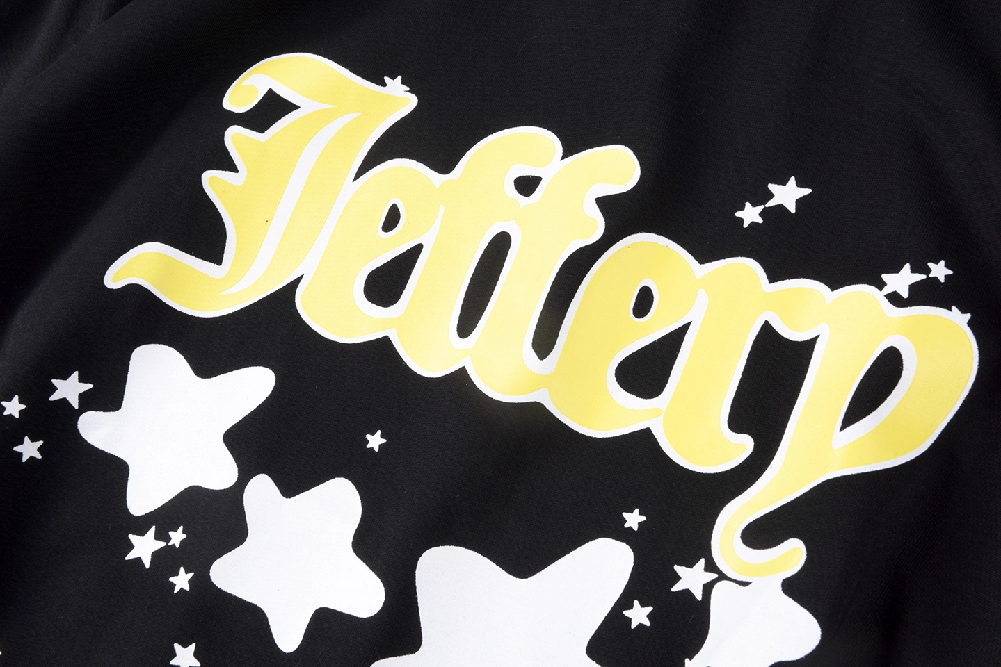 The Sp5der Black & Yellow “Jeffery” Star Graphic T-Shirt blends bold color contrast with playful street graphics. Crafted on a deep black cotton base, the front features a standout yellow “Jeffery” script logo accented by oversized white star graphics and scattered mini stars for added movement and dimension. The clean black backdrop enhances the vibrant yellow lettering, making the design pop effortlessly.