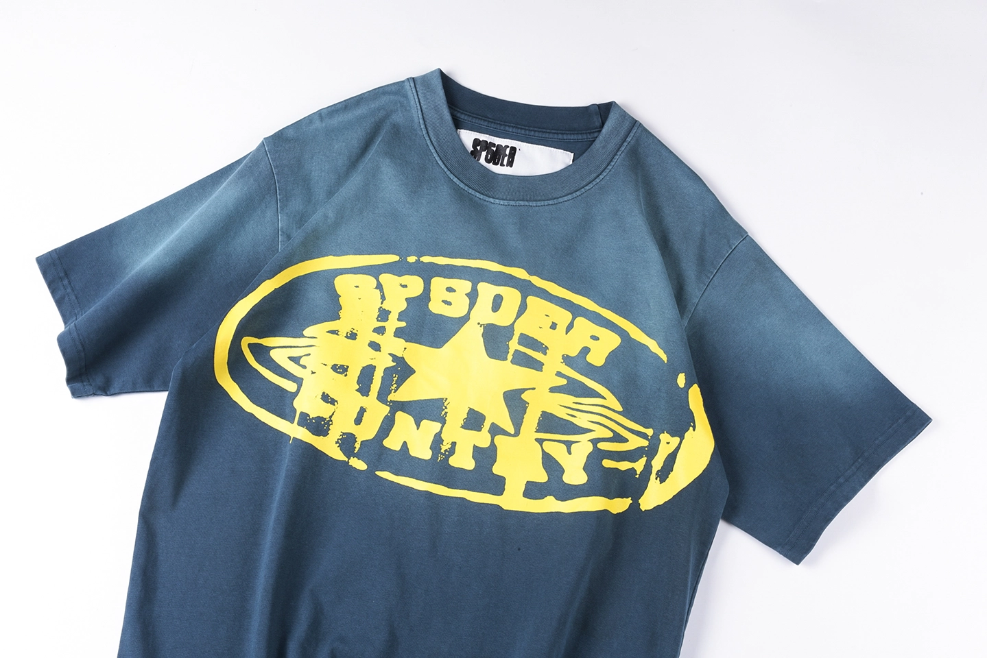 Featuring a washed blue base, the fabric delivers a subtle faded effect that enhances its streetwear appeal. The front is highlighted by a large yellow planet-style graphic with Sp5der branding, creating a strong visual contrast and eye-catching look.