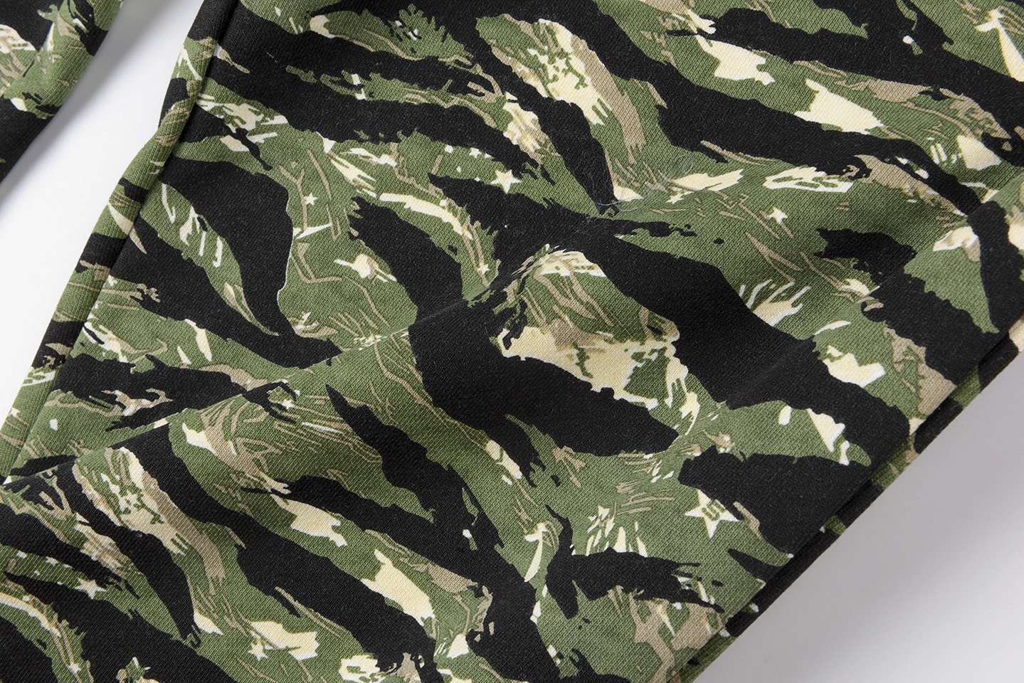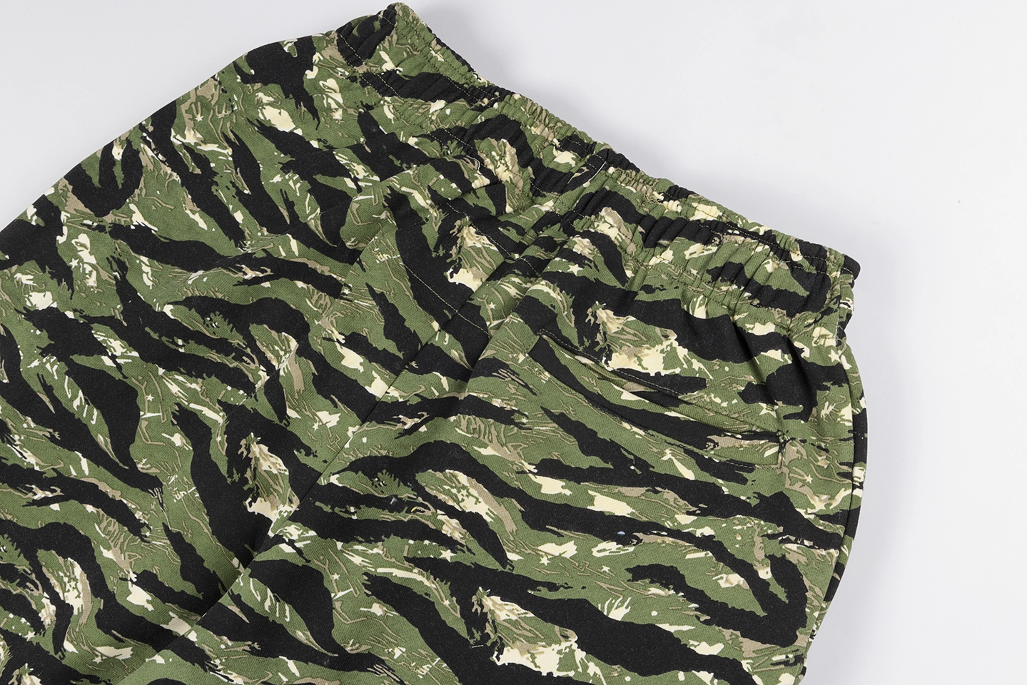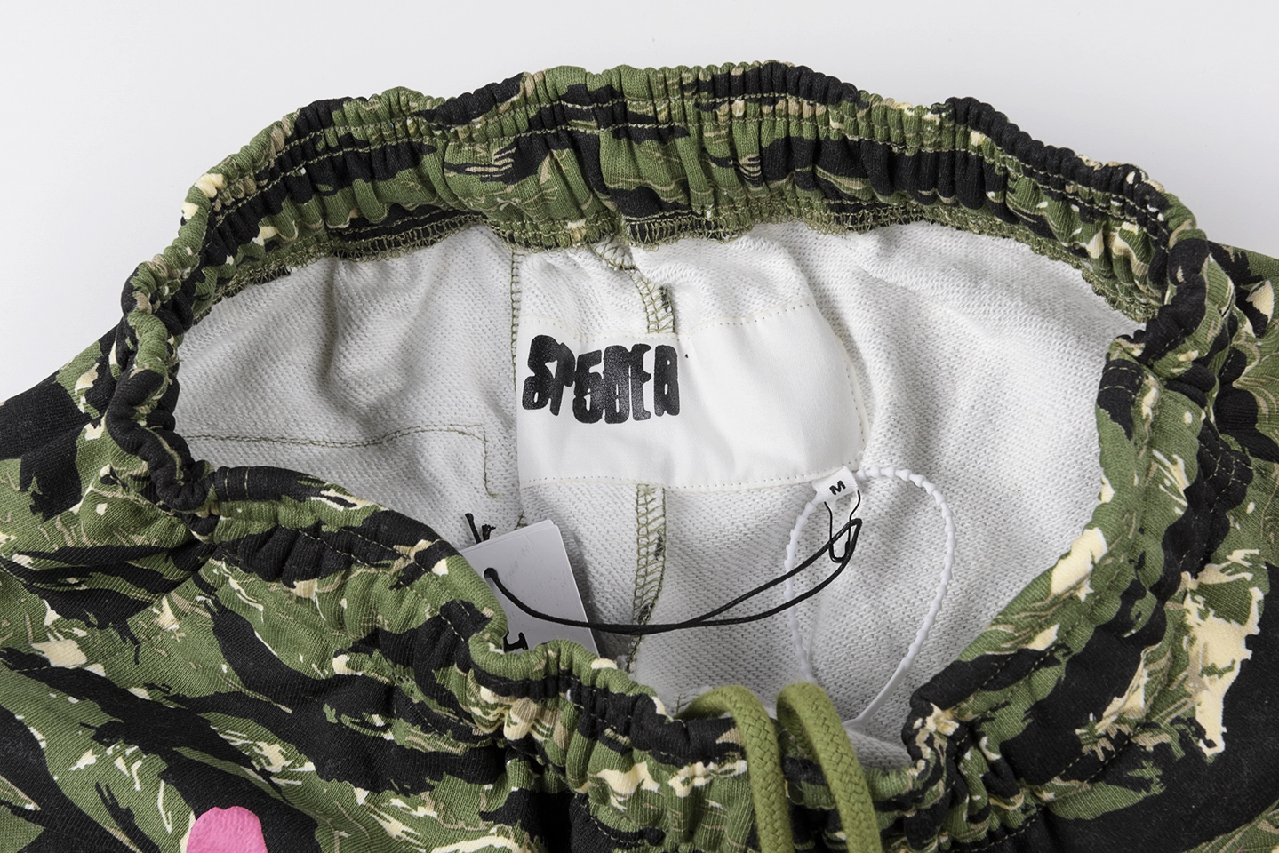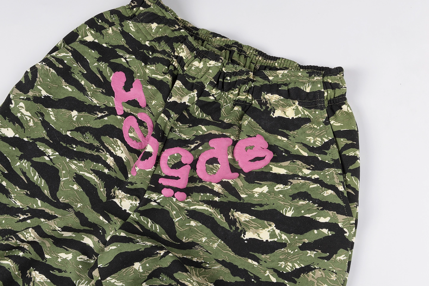 The pants feature an all-over green tiger camo print, delivering a rugged, high-contrast visual that stands out while remaining versatile. On the back, a Sp5der logo graphic in contrasting pink adds a pop of color and signature branding, creating a striking contrast against the camouflage base.