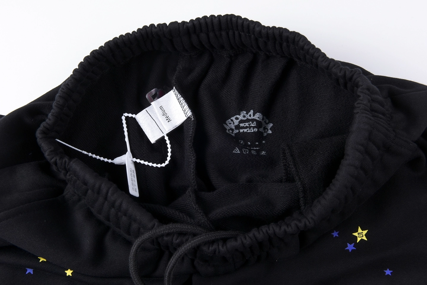 The Sp5der Midnight Stardust Pink Script Sweatpants combine playful color pops with bold street graphics. Built on a deep midnight black base, the design features scattered multi-color stardust accents across the upper leg, paired with an oversized cotton-candy pink Sp5der script running vertically down the leg. A subtle yellow slogan detail enhances the layered visual effect, creating strong contrast against the dark foundation. Finished with an elastic waistband and cuffed hems for a clean tapered silhouette.