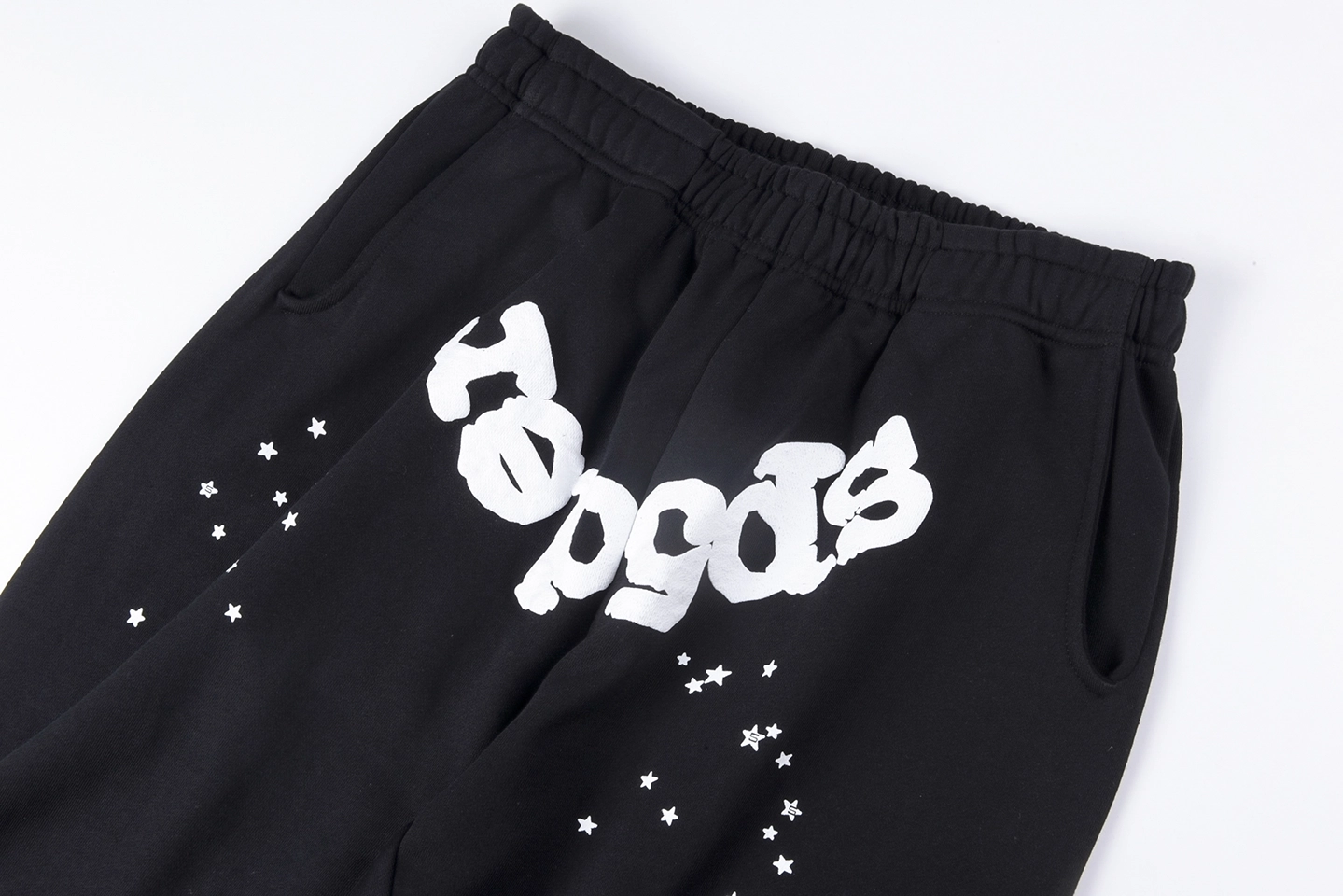 The Sp5der Midnight White Stardust Script Sweatpants deliver a clean monochrome take on bold street graphics. Set on a deep midnight black base, the design features an arched bright-white Sp5der script across the upper front, complemented by scattered white stardust accents cascading down the leg. The crisp contrast keeps the look sharp and minimal while maintaining signature Sp5der attitude. Finished with an elastic waistband and cuffed hems for a streamlined tapered silhouette.
