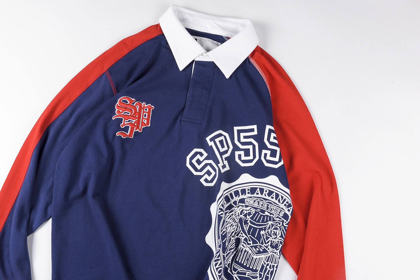 Front and back are detailed with oversized Sp5der-inspired graphics, collegiate-style lettering, and emblem prints, combining sport heritage with contemporary street aesthetics. The asymmetrical layout enhances the visual layering, making the piece stand out from standard polos.