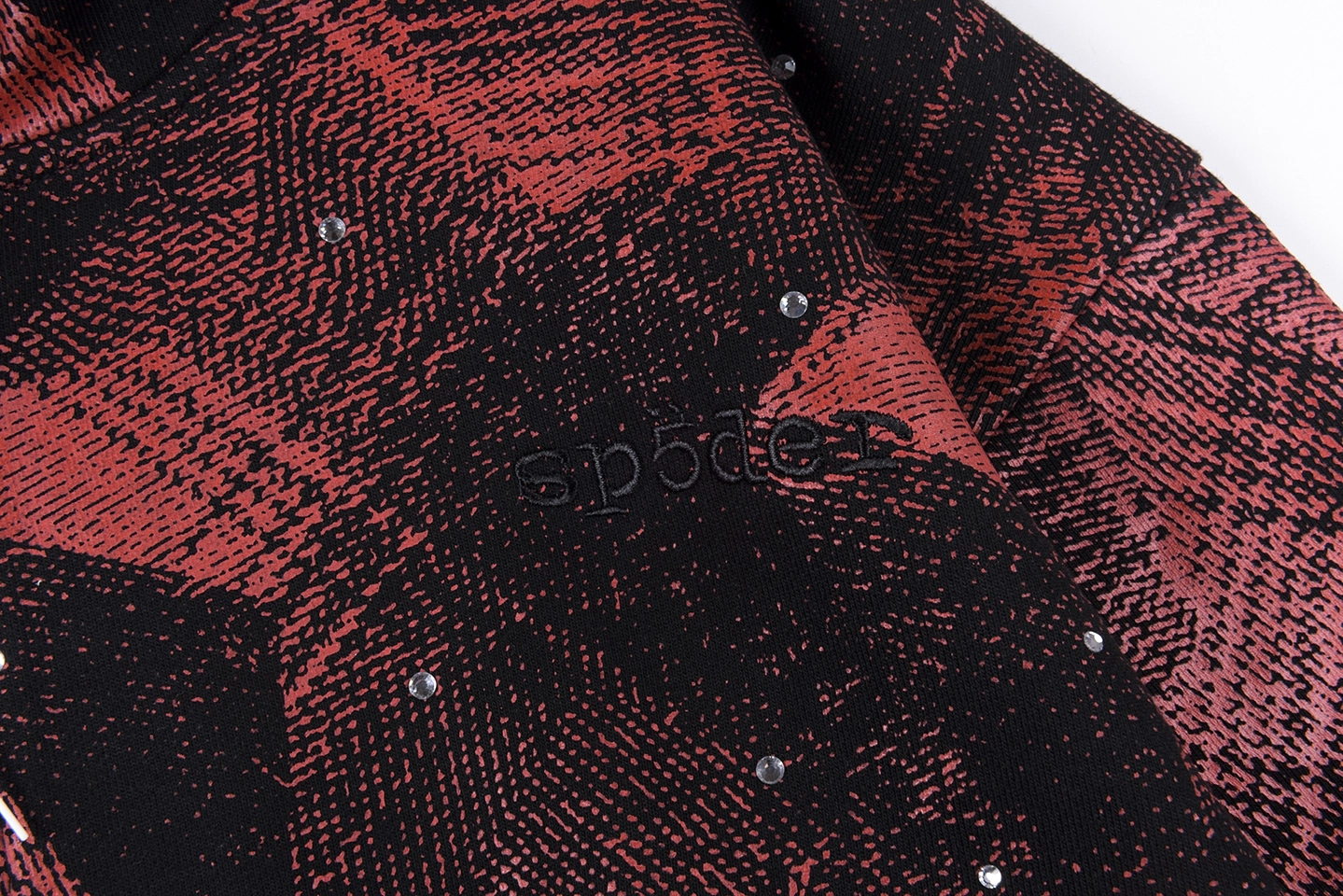 The Sp5der Red Black All-Over Print Zip Hoodie pushes bold streetwear energy with a full-coverage graphic design and standout visual texture.