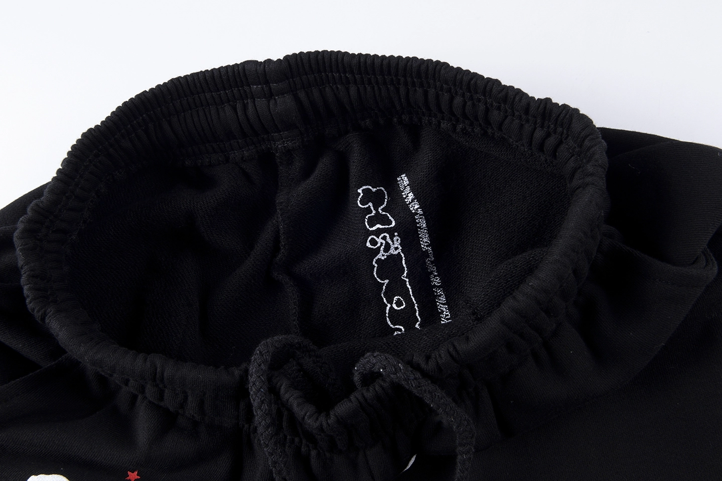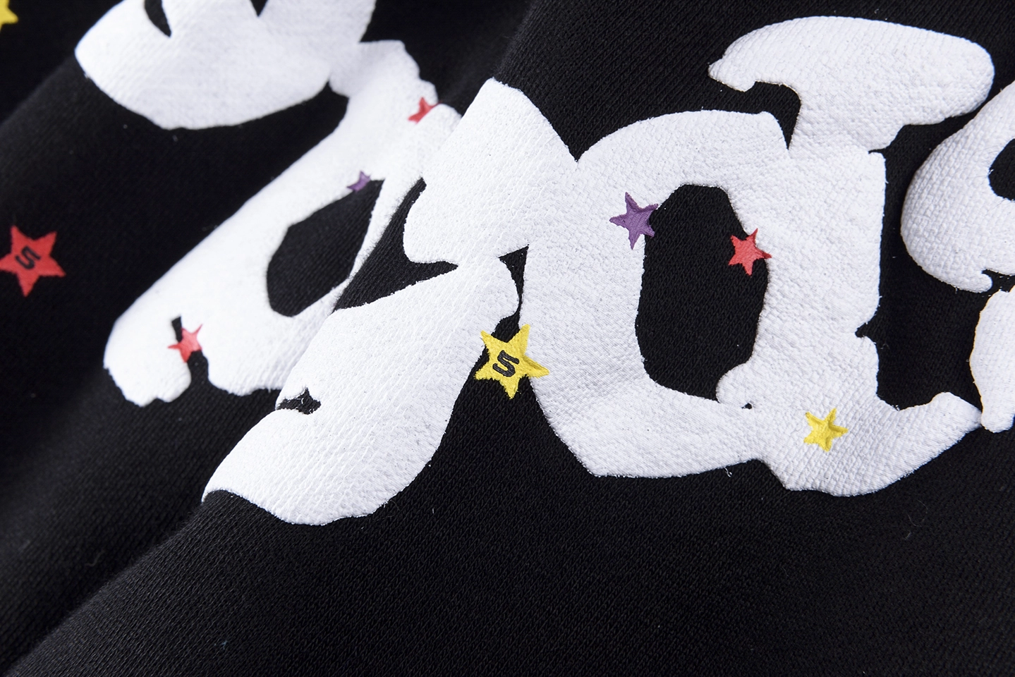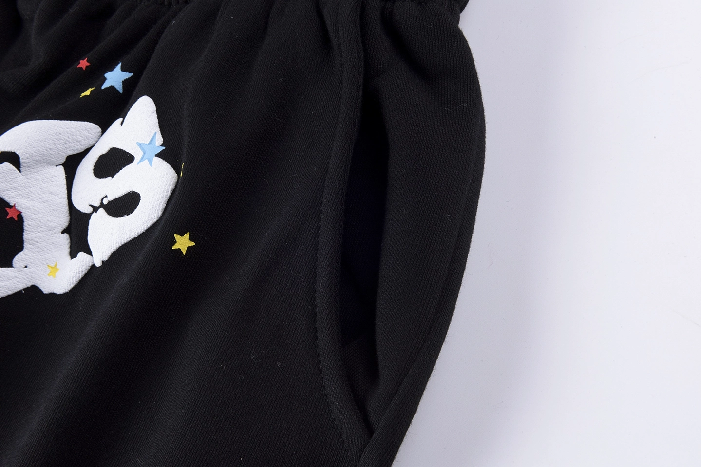The Sp5der Star Logo Graphic Sweatpants bring a clean yet playful Sp5der streetwear identity to an everyday essential. Constructed on a jet black cotton base, these sweatpants feature a bold arched “sp5der” logo print across the upper back, surrounded by scattered multicolor star graphics that add contrast and visual energy. With a relaxed tapered fit, elastic waistband, and cuffed hems, this piece blends comfort with unmistakable brand attitude, perfect for both lounging and street styling.