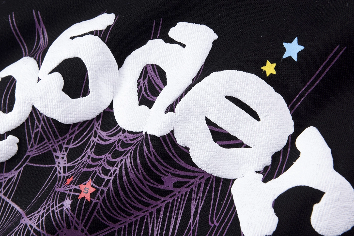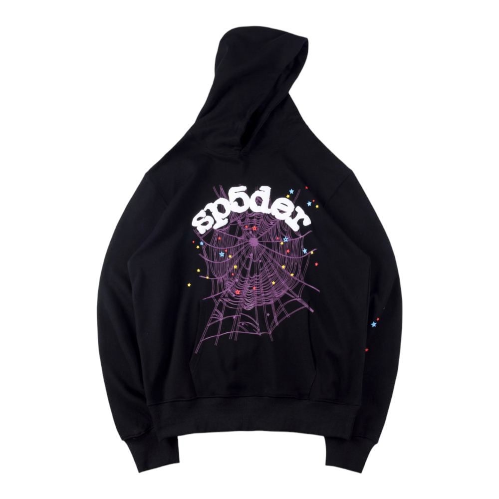 The Sp5der Web Star Graphic Hoodie delivers a signature Sp5der street aesthetic through bold symbolism and clean contrast. Built on a jet black cotton base, the hoodie features a striking purple spider web graphic across the back, scattered with multicolor star accents for a playful yet edgy visual impact. The arched “sp5der” logo typography crowns the design, reinforcing brand identity with a graffiti-inspired touch. With its relaxed street silhouette and minimal front, this piece balances statement graphics with everyday versatility.