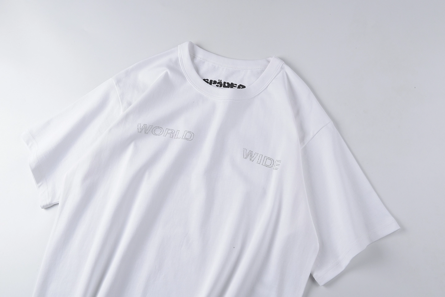 The Sp5der World Wide Minimal T-Shirt delivers a clean, understated take on signature branding. Crafted from a crisp pure white cotton base, the front features subtle tonal “WORLD WIDE” lettering across the chest, creating a refined, low-contrast aesthetic. The back is finished with a large matte horned emblem graphic in soft grey, adding depth while maintaining the minimalist color palette. Designed with a relaxed silhouette and classic crew neckline, this piece blends quiet branding with elevated everyday wear.