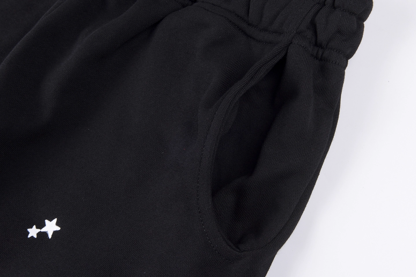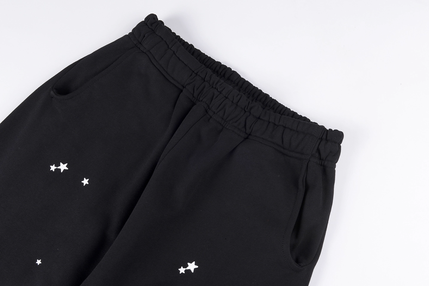Cut from heavyweight cotton in deep black, the Sp5der Yellow Star Logo Sweatpants feature a bold yellow “Sp5der” gothic logo down the right leg. Scattered white star graphics across the hips and thigh lend a celestial edge, blending cosmic visuals with classic streetwear energy. Ribbed cuffs and an elastic waistband complete the laid-back silhouette.