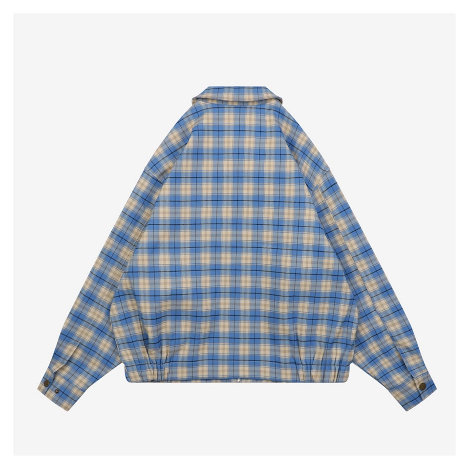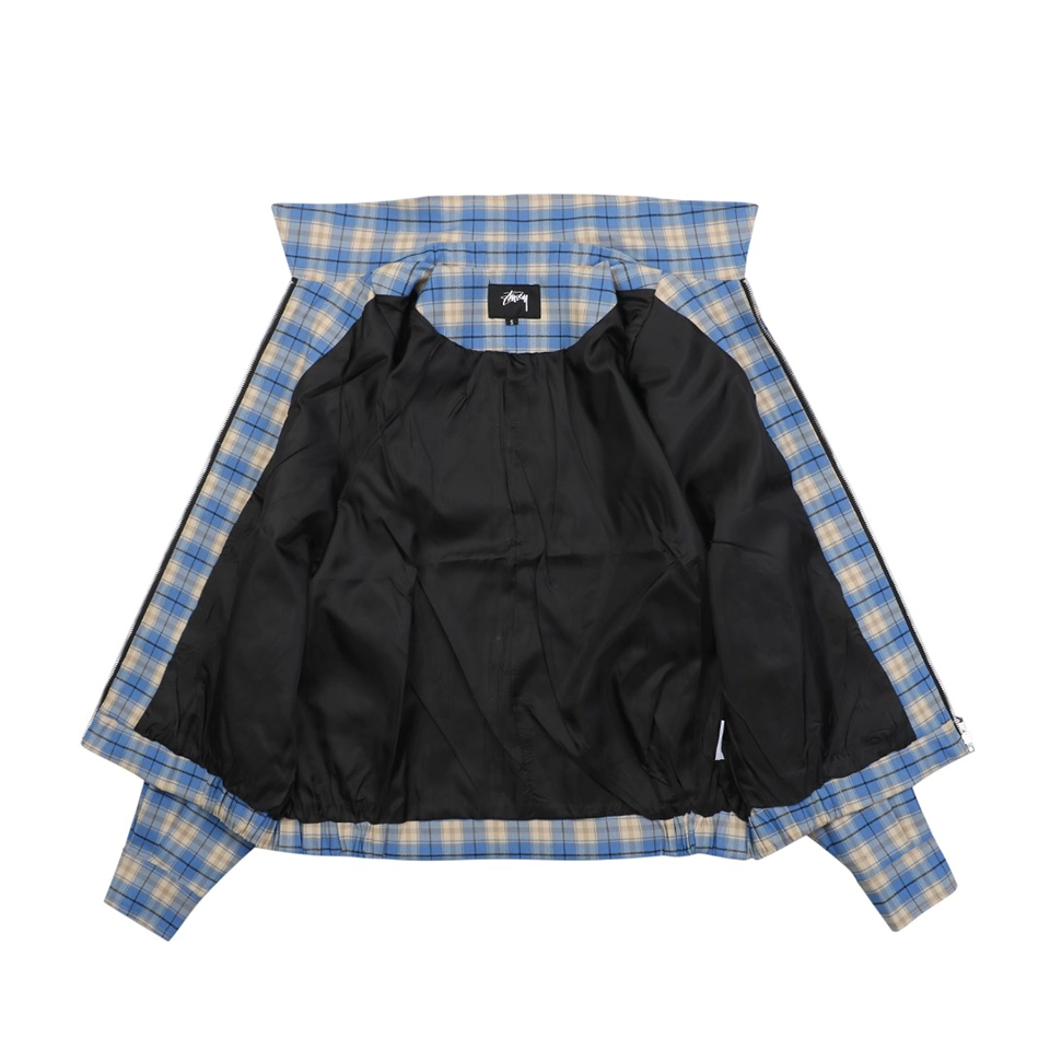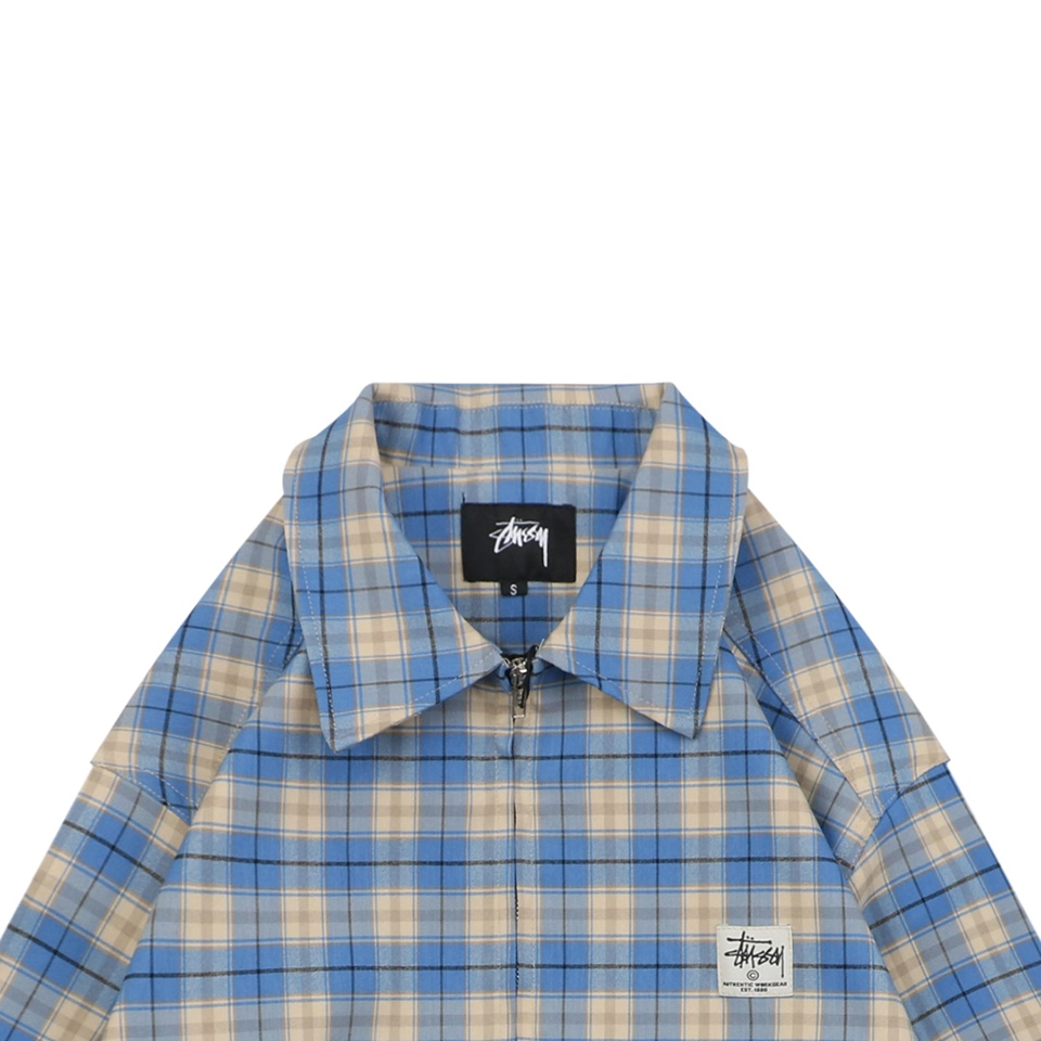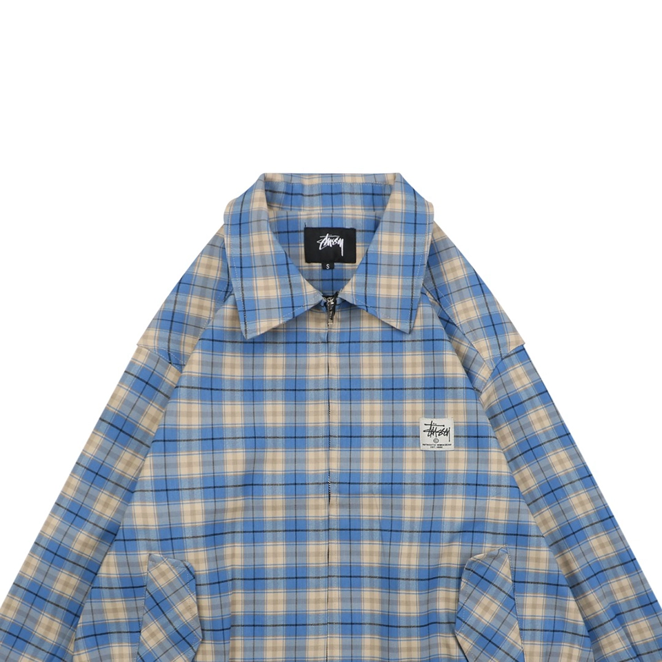 The Stussy Blue Plaid Logo Patch Jacket blends classic streetwear with vintage flair. Featuring a retro blue and beige plaid pattern, this piece includes a front zip closure, two angled front pockets, and an understated logo patch on the chest. The elasticized hem and cuffs ensure a comfortable, slightly structured fit, while the lightweight material makes it perfect for transitional weather.