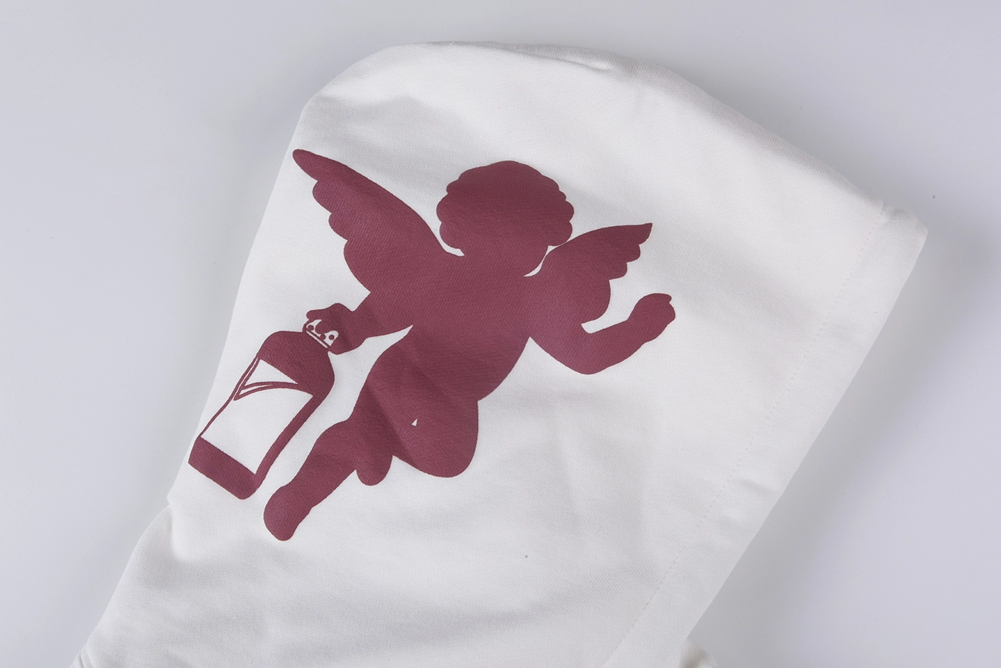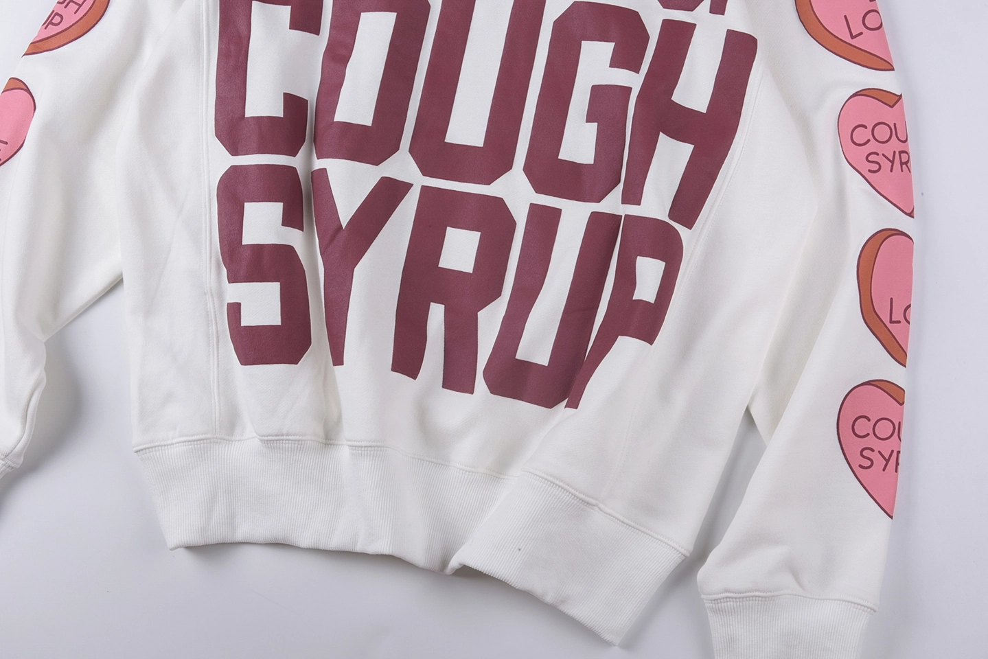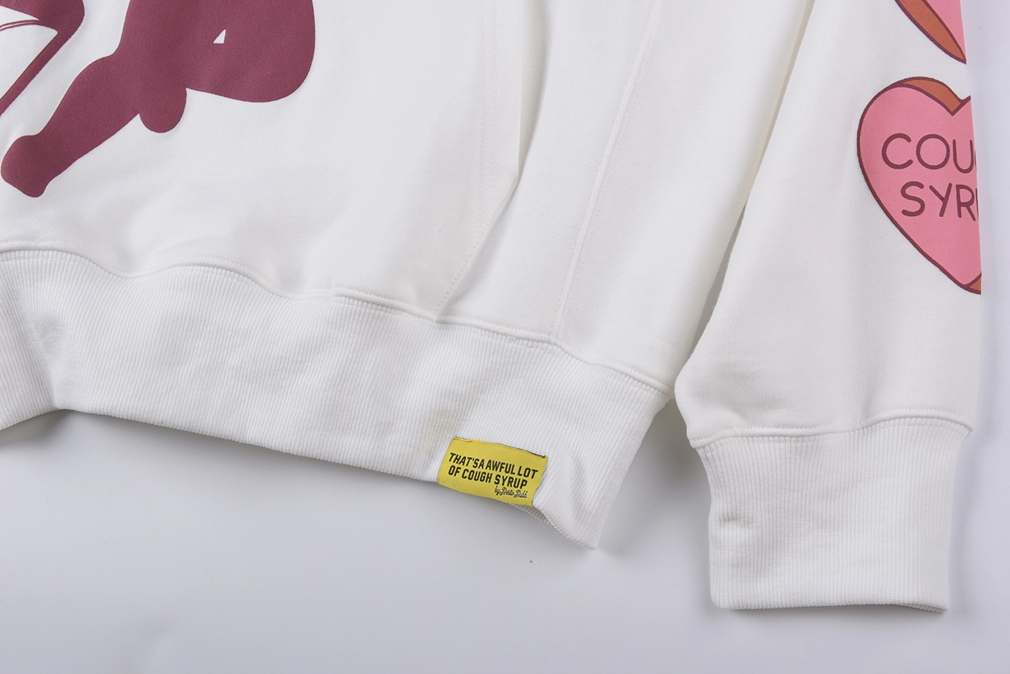 The That’s A Awful Lot of Cough Syrup Cupid Graphic Hoodie – White is a bold statement piece blending streetwear edge with ironic romanticism. Featuring a large cupid print on the front holding a syrup bottle and oversized “I LOVE COUGH SYRUP” lettering on the back, this hoodie embraces rebellion and pop culture aesthetics. Heart-shaped graphics run down the sleeves, echoing vintage Valentine candy styles. Crafted from heavyweight fleece cotton, it provides both comfort and visual impact.