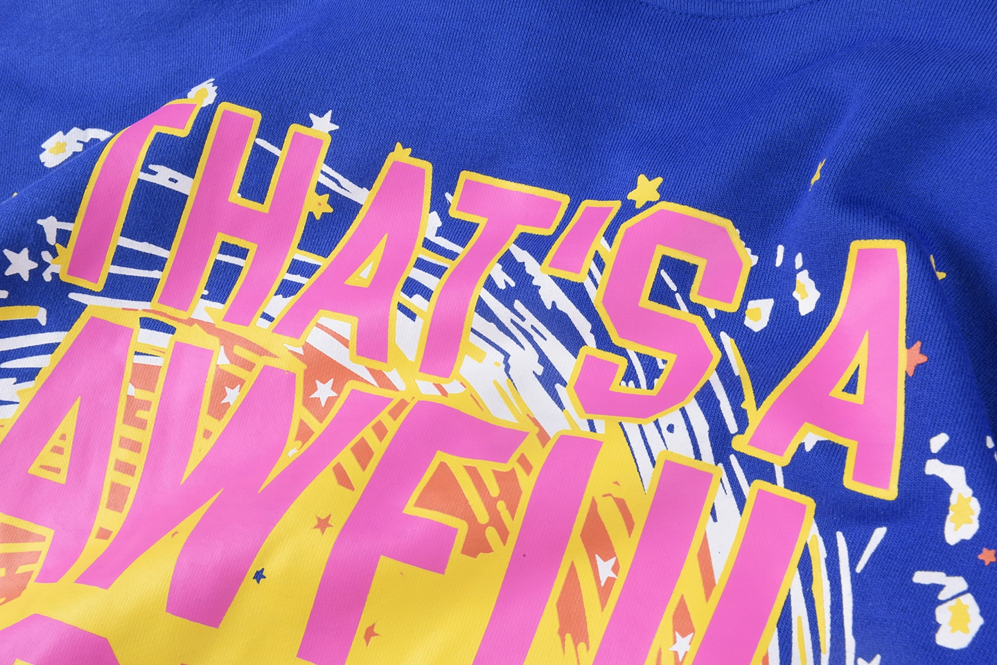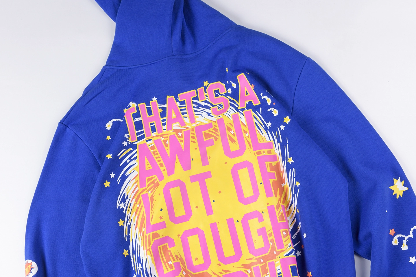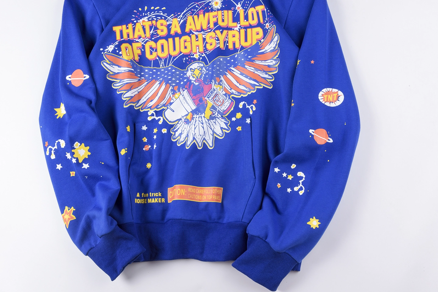 The That’s A Awful Lot of Cough Syrup Space Eagle Blue Hoodie delivers bold cosmic energy with an eye-catching galactic motif. A soaring eagle grips a double cup in its talons beneath the signature phrase “THAT’S A AWFUL LOT OF COUGH SYRUP,” set against a vivid night-sky blue canvas. Accented with planets, stars, and surrealist graffiti details across the sleeves, this hoodie merges streetwear attitude with psychedelic storytelling. Ribbed cuffs, a relaxed silhouette, and a front kangaroo pocket complete the look, making it a standout for any statement wardrobe.