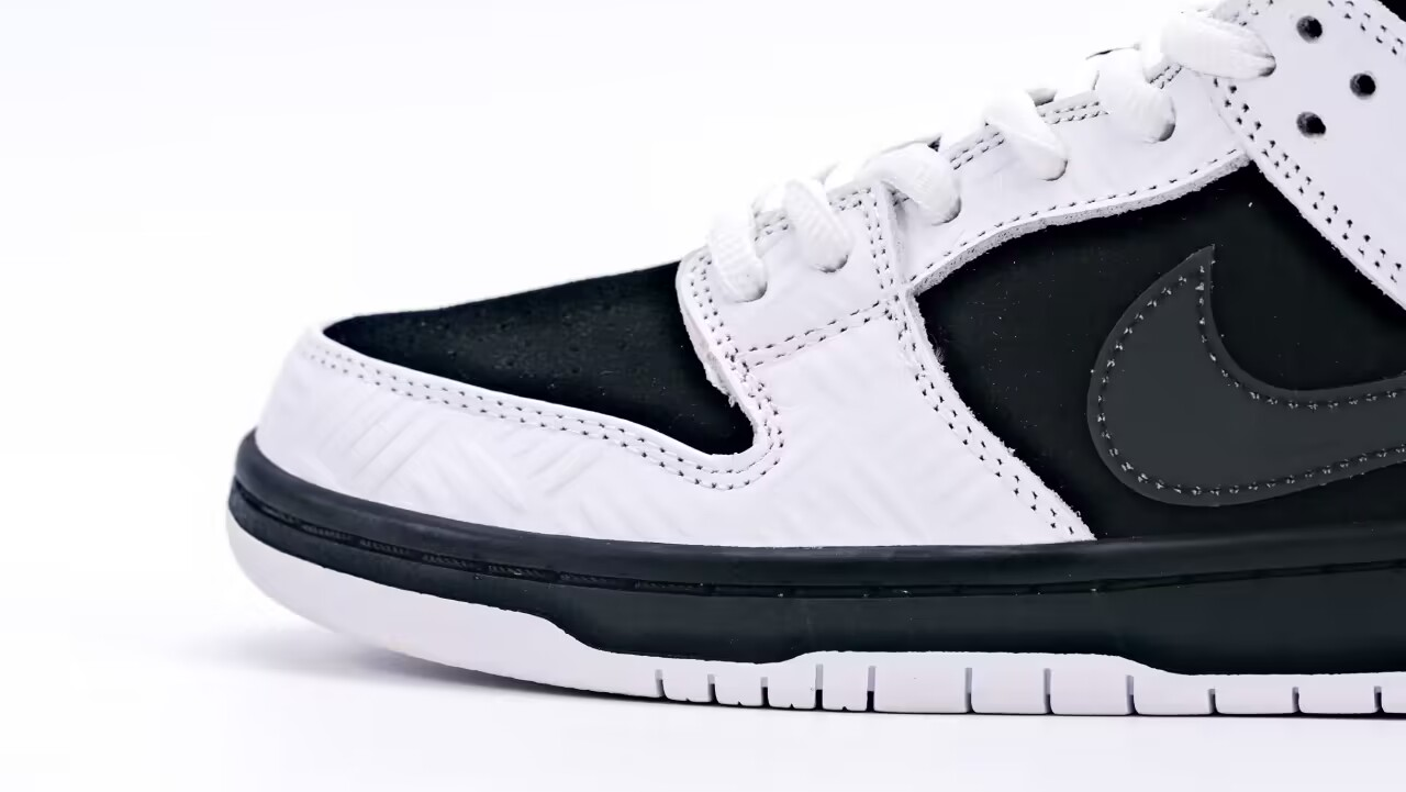 The TIGHTBOOTH x Dunk Low SB is equipped with Nike SB’s Zoom Air insoles, which provide superior cushioning and impact protection, crucial for skateboarding. The padded tongue and collar not only add to the comfort but also improve the fit, making it secure and snug for active use. The outsole features a grippy, durable design typical of Nike SB sneakers, optimized for skateboarding with excellent traction and control.
