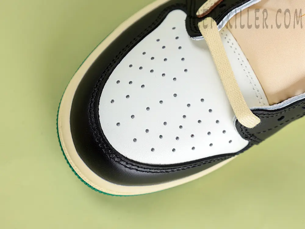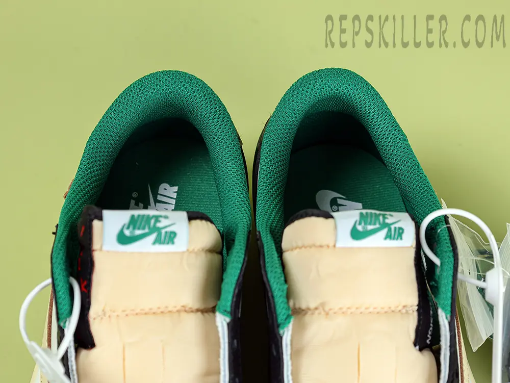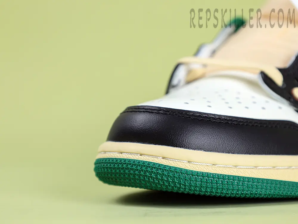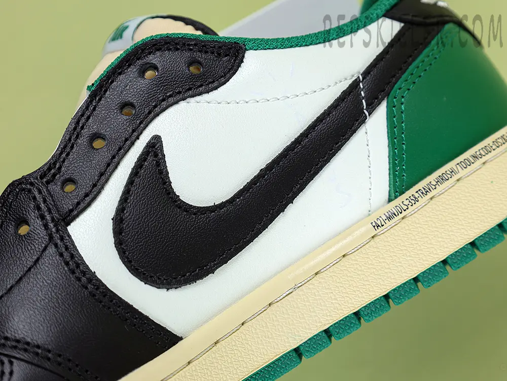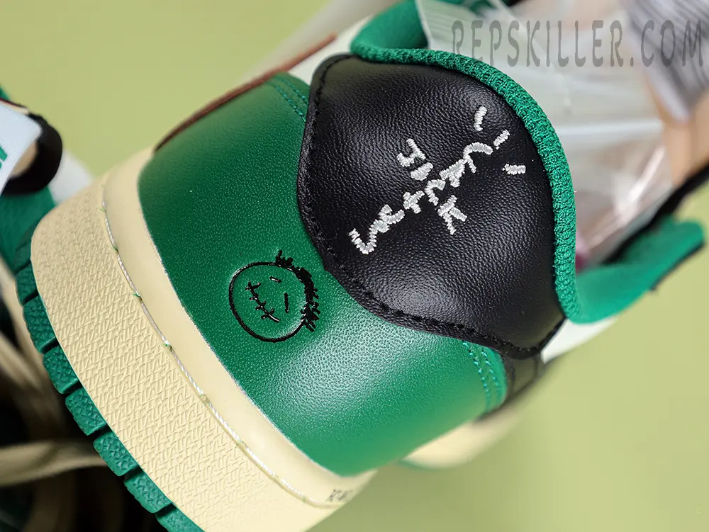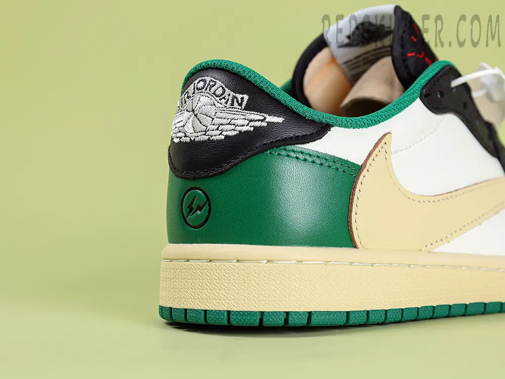 The Travis Scott x Air Jordan 1 Retro Low OG ‘Green/Black’ delivers a bold remix of La Flame’s signature silhouette. Featuring a white leather base with black overlays and a striking green heel, the sneaker’s color blocking commands attention. The reverse Swoosh arrives in a cream tone, matching the aged-look midsole. Cactus Jack branding is stitched on the heel, while extra green details line the outsole and tongue tag. With its rich contrast and distinctive identity, this pair continues Travis’s disruptive design legacy.
